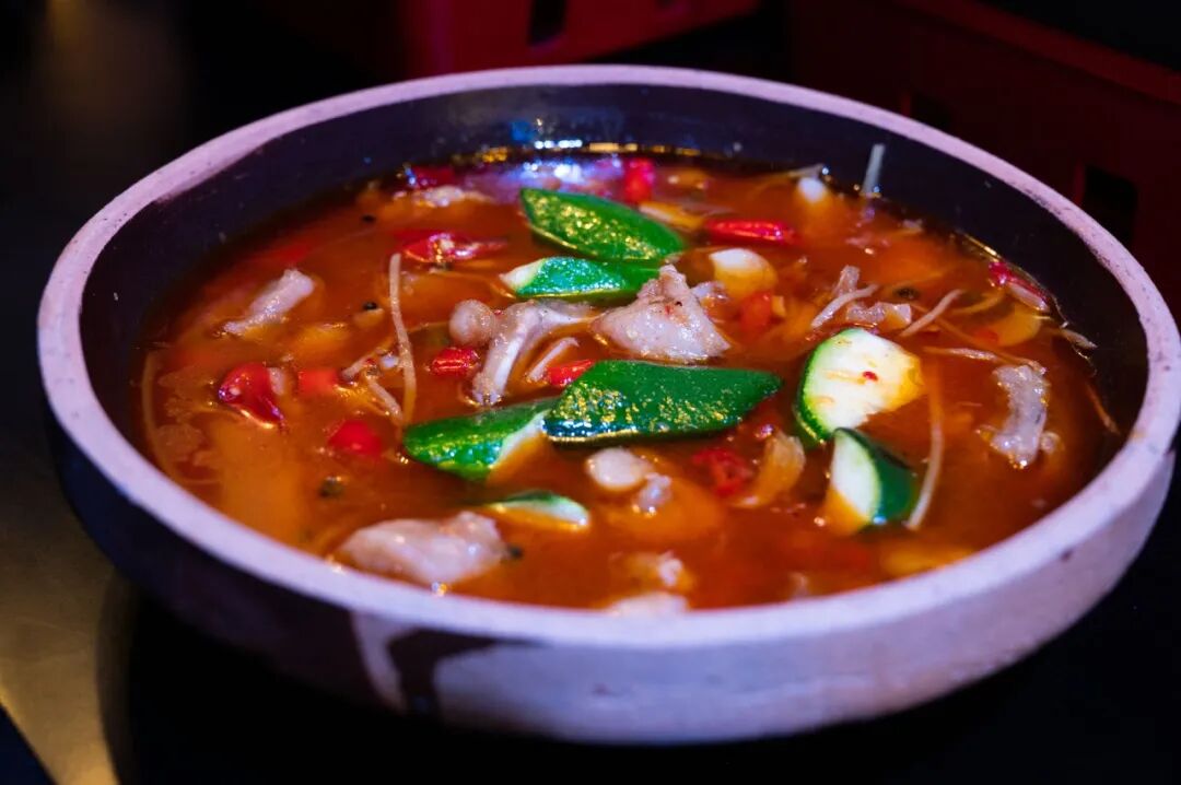 配菜也都很入味,黑豆花配烤鱼,确实是第一次吃。老板娘告诉我们,豆花是川渝地区的特色,这个黑豆花是店里每天早上去豆乳店里采购的新鲜黑豆浆手工制作的,经常有客人单加好几份。豆花的口感介于老豆腐和嫩豆腐之间,沾上了香辣的汤汁,入口还能吃到黑豆的香味。
