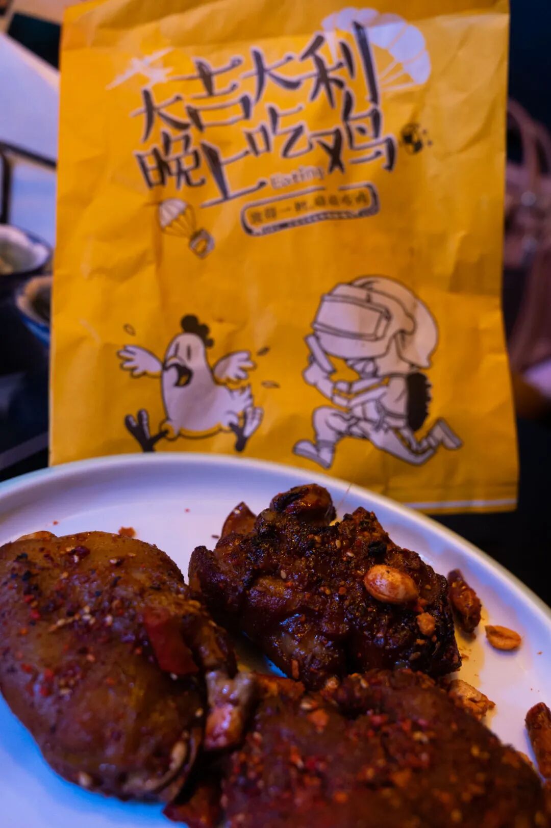 需要先摇一摇才能吃的烤猪蹄?这个形式有点新鲜。菜上桌后,小编摇一摇纸袋,倒出了里面的烤猪蹄,原来里面撒了辣椒面等调料,需要摇匀了再吃。猪蹄很Q弹,全是胶原蛋白。