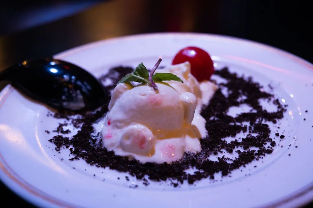外形是一只趴着的小猪,四周撒了巧克力碎,入口是冰淇淋的口感,有点不忍心下口。老板娘告诉我们,之所以能有这么多新颖的菜品,是因为厨师长定期回国考察,才能做到与国内接轨。