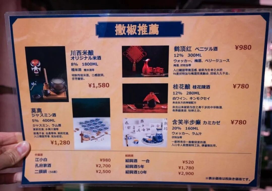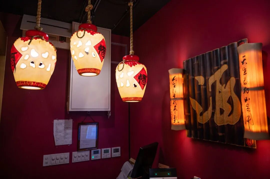 入口左手边是一个吧台,摆满了各类酒水,名字也挺有特色,含笑半步颠、莫离、鹤顶红……这些喝了真的没事?听到我们的疑问,老板娘赶忙为我们解释,这些都是果酒,酒精含量从5%到20%不等,口感各有千秋,等会可以尝尝看。