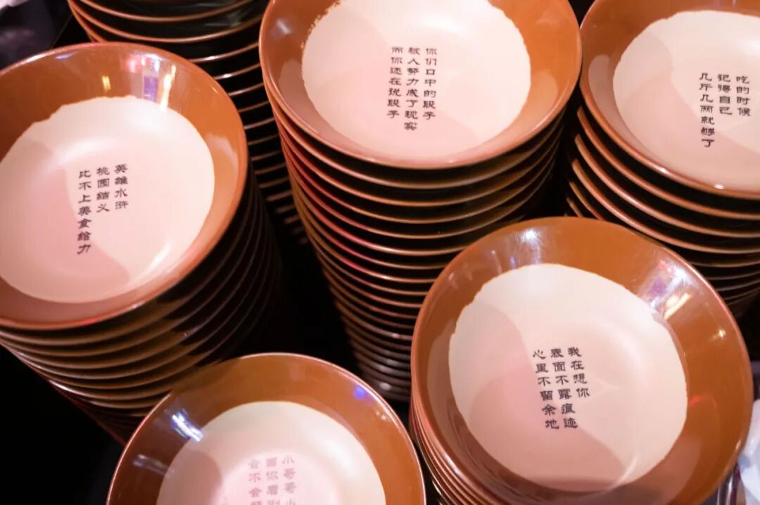 在等待上菜的时候,小编注意到桌上的碗碟都印着网络流行语,或是水浒传的一百零八将,细节满满。