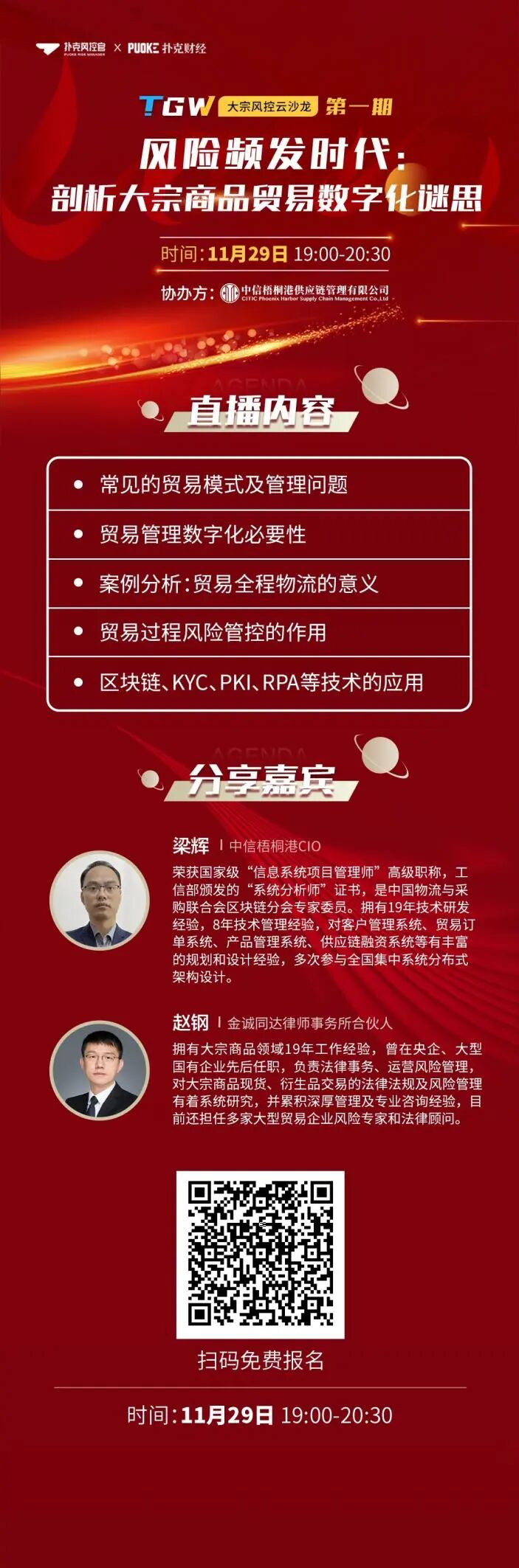 为此,扑克财经特别邀请中信梧桐港CIO梁辉老师和金诚同达律师事务所合伙人赵钢老师作为扑克财经TGW大宗风控云沙龙第【1】期的嘉宾,和大家一起探讨常见的贸易模式及管理问题以及如何通过数字化方式做好大宗贸易管理。我们诚邀大宗商品贸易企业负责人、业务部门、风控部门、法务部门及相关部门参与此次云上沙龙,共同学习探讨!扫码下方图片二维码即可免费报名!