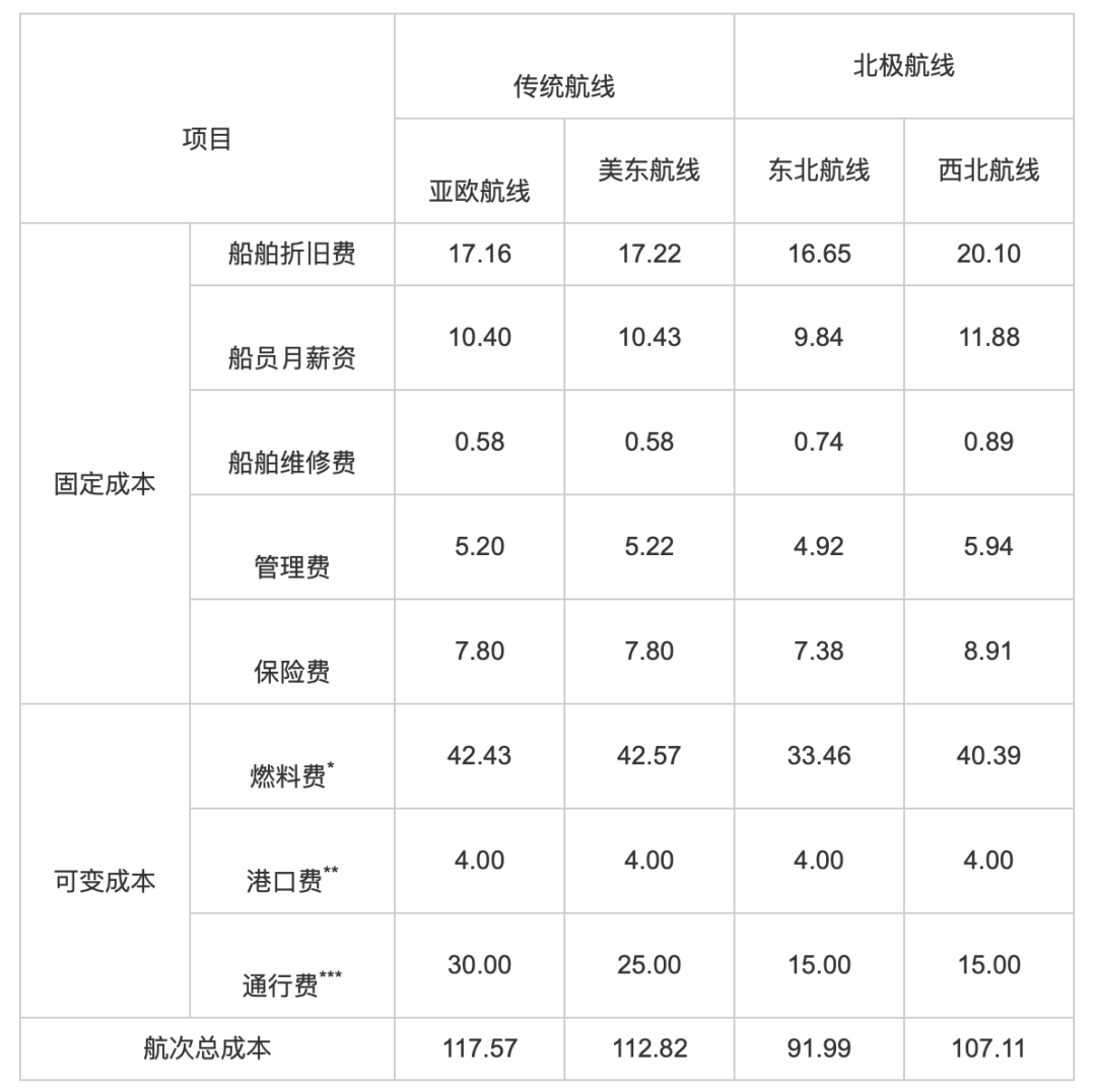 第一阶段,气候冷暖交替,冰量小幅下降(1979~1996年)。卫星观测数据显示,1979~1996年北极地区海冰量上下波动,变化幅度不大,总体来说有下降趋势。1979~1988年,9月平均海冰量平稳,海冰范围在470.8万平方公里水平小幅波动;1989~1996年,海冰范围的波动幅度增大,北极冰层冻结和融化程度加大,1995年夏季海冰覆盖面积出现最小观测值后1996年9月又回升至最大值。气候作为影响北极海冰覆盖面积的一个重要因素,其冷暖交替使北极冰区面积呈现上下波动、小幅下降的变化趋势。第二阶段,冰量明显减少,偶有少量回升(1997~2007年)。1997年北极海冰覆盖面积较1996年同期有所缩小,且在之后10年中缩小趋势越来越明显。1997~2001年,冰量略有浮动,但海冰覆盖面积始终处于总体趋势线上方;2002年9月海冰覆盖面积降至403万平方公里,比2001年减少12.2%;2003年略升至405万平方公里,增长0.5%;2004年为439万平方公里,较2003年减少34万平方公里;2005年和2006年受全球高温影响,特别是北大西洋暖流影响,9月海冰覆盖面积分别降至407万平方公里和401万平方公里;2007年9月,全球高温导致北极海冰迅速融化,海冰覆盖面积跌至282万平方公里,为有观测记录以来的最低值,据观测,该年夏季海冰缩减区域主要集中在东西伯利亚海、拉普捷夫海、波弗特海以及加拿大群岛海域。可以看出,1997~2007年,海冰覆盖面积只在2000年、2001年、2003年和2006年有所扩大,且回升量较小。冰量总体减少的趋势明显,减少的幅度和速度均高于上一阶段。第三阶段,冰量短暂回升,持续降至低谷(2008~2012年)。与2007年相比,2008年海冰覆盖面积有所回升,但仍低于2007年以前次低点纪录,致使9月海冰覆盖面积的缩减率由每10年8.8%变为24%;2009年海冰覆盖面积继续回升,为376万平方公里,但比过去30年最低值的均值还要少87.3万平方公里;2010~2012年海冰覆盖面积由334万平方公里降至321万平方公里,不断刷新北极海冰范围的最低纪录,特别是2012年3~9月海冰融化面积达1 100万平方公里。在这一阶段,北极海冰覆盖面积在经历了短暂扩大之后,从2009年开始持续缩减,直到2012年出现有史以来平均海冰覆盖面积最小,这也使“夏季海冰范围总体上不断地以较大幅度减少”的趋势愈加明朗。第四阶段,冰量略有回升,后持续下降(2013~2019年)。2013年海冰覆盖面积升至378万平方公里,但仍比过去35年的最低值少12.9%;2013~2016年海冰覆盖面积直线缩减,由378万平方公里降至291万平方公里,减少23%;2017年海冰覆盖面积略有回升,达335万平方公里;2017~2019年海冰覆盖面积持续缩减,由335万平方公里降至313万平方公里,为历史第四低值。在这一阶段,北极海冰覆盖面积在2016~2017年略有回升后,从2017年开始持续缩减,直到2019年出现历史第四低值,这使“夏季海冰范围不断缩小”的趋势更加明显。总体来看,北极海冰覆盖面积呈现不断减少的趋势,且减少幅度逐渐增大,海冰的融化速度明显高于预期。未来,北极冰层将继续融化,冰区范围不断减少,最终将出现夏季无冰年。目前,北极航线仅在夏季短暂开通,其中东北航线和西北航线夏季通航时间最长可达45天和64天。美国国家海洋和大气管理局研究指出,2034年北极可能出现夏季无冰状态,届时北极航线将无须破冰船引航,东北航线和西北航线的通航时间将大大延长。北极航线的应用前景和经济效益受海冰变化情况、航运距离、航行时间和社会效益等因素共同影响,因此在下面的研究中将选取北极航线海冰融化趋势、适航船舶、航行距离、航行时间、航次成本等指标。数据主要来源于美国国家冰雪数据中心、《北极航行指南》、北方海航道管理局、联合国贸易和发展会议、“BLM-Shipping”。中欧和中美航线主要为途经苏伊士运河和巴拿马运河的传统航线,因此,以上海—鹿特丹和上海—纽约为例,对北极航线和传统航线航次成本进行估算。从航行距离来看,北极航线比传统航线优势明显,其中东北航线和西北航线分别缩短2563海里和1912海里。对传统航线来说,除航行距离外,途经运河的等待时间也是两条航线航行时间差别的主要原因。根据现有亚欧航线和美东航线统计,按照多用途货船经济航速14kn计算,北极航线船舶正常航速为14kn,但在海面冰情较为严重的海域,东北航线降至12kn,平均航速为13.41kn;西北航线降至11kn,平均航速为12.08kn;从航行时间来看,北极航线较传统航线缩短1.6~6.6天。总体来看,远东港口经北极航线至欧洲和北美洲在航行距离和航行时间上均有较大优势。船舶航运成本主要分为固定成本(船舶折旧、船员薪资、保险费、维修费和管理费)和可变成本(燃料费、港口费和通行费)。下文根据中国商船北极航行实践和郝增辉的相关研究,基于北极航行常用船型多用途船核算传统航线与北极航线单航次航运成本。▲ 传统航线与北极航线航次成本比较(单位:万美元)从传统航线和北极航线航次成本核算来看,由于航运距离的缩短,北极航线航行时间和燃油成本实现较大缩减,致使北极航线的航次成本总体低于传统航线。但受自然环境的影响,北极航线只能夏季短暂通航,这使得北极航线的航次成本优势并不非常明显。未来,随着北极航线通航环境的改善及通航时间的延长,北极航线的航运经济性将不断凸显。美国国家海洋和大气管理局指出,海上船舶排放的氮氧化合物占全球排放量的30%,成为全球空气污染的重要来源之一。根据国际海事组织(IM