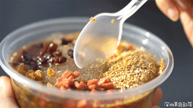 晶莹剔透的冰粉上铺满馅料,最后淋上熬制的红糖,视觉效果满分,终于能明白为啥川蜀人民对它欲罢不能了。