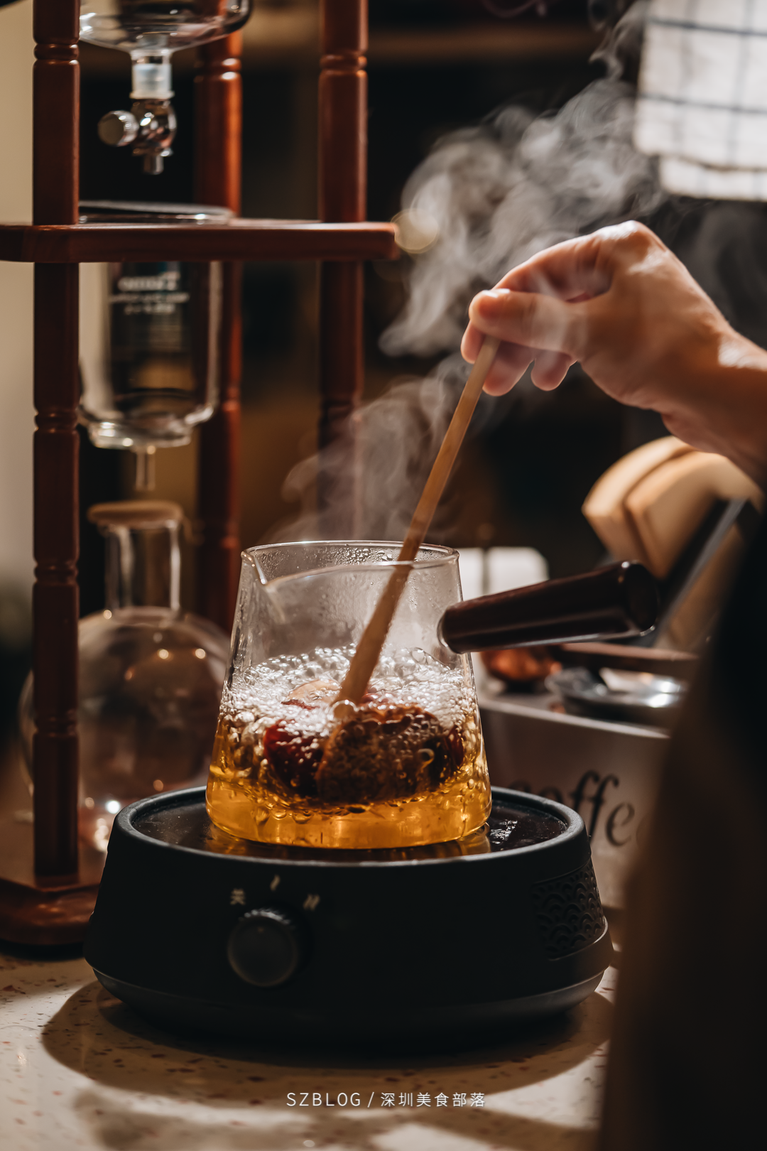 做咖啡前,专业做陈皮茶的娜姐,一壶茶煮的极好。高温沸煮15分钟后,再焖煮上一会,待到配料的滋味与陈皮相融合,辛中带甘。