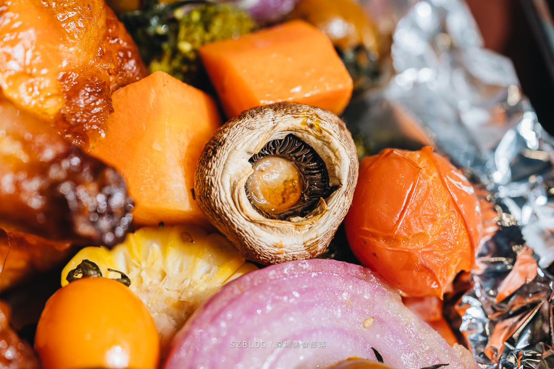 蘑菇考完之后自然的渗出鲜甜的汁水,小番茄考过之后也是爆汁的状态,如果加了西蓝花看蔬菜稍微上色以后可以加盖锡纸,这样可以保持水分,也可以让颜色好看~