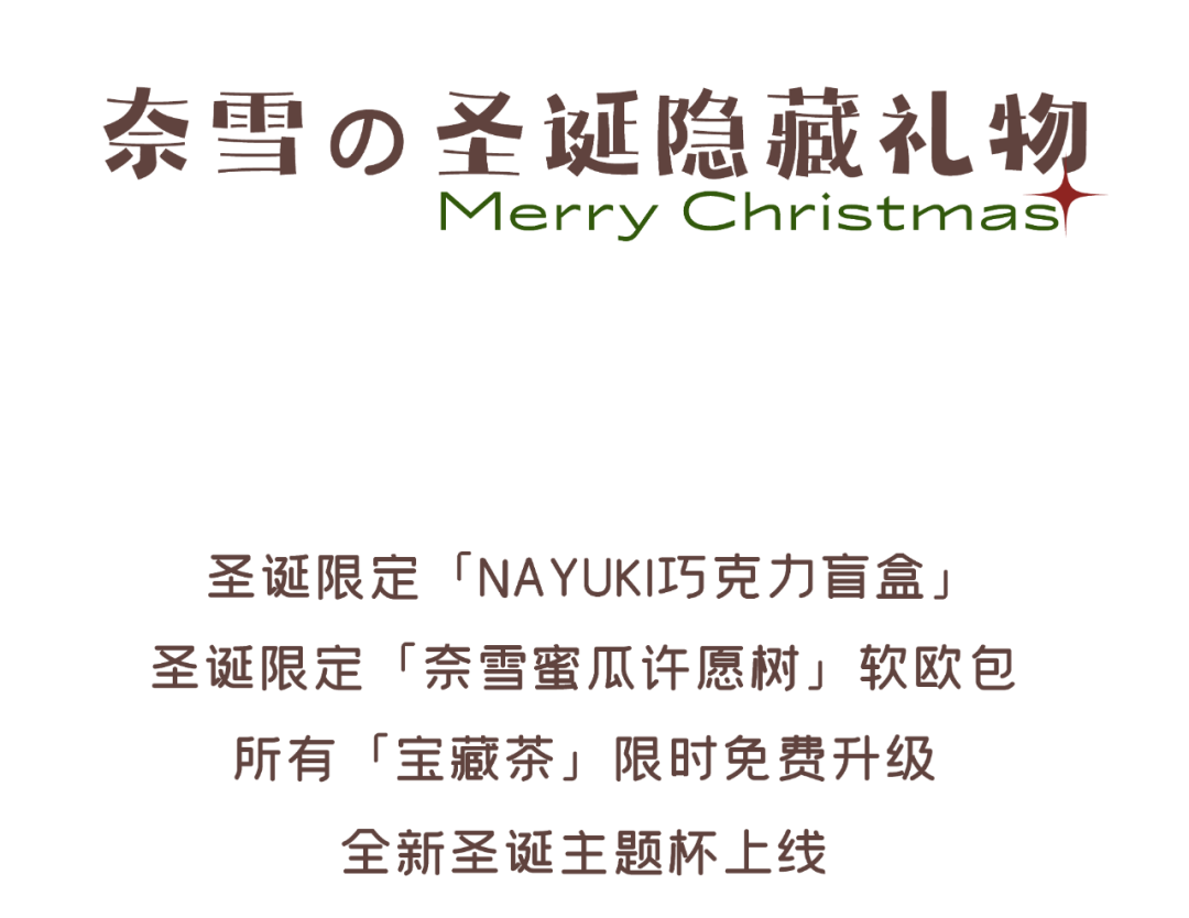 巧克力盲盒只作为活动限定福利,数量有限,先到先得,兑完即止。活动从12.21开始,只有5天。所以中奖后,要抓紧带着中奖杯贴到门店领取随机一款「NAYUKI圣诞盲盒巧克力」,不可外卖领取哦~这个圣诞,你会怎么过呢?