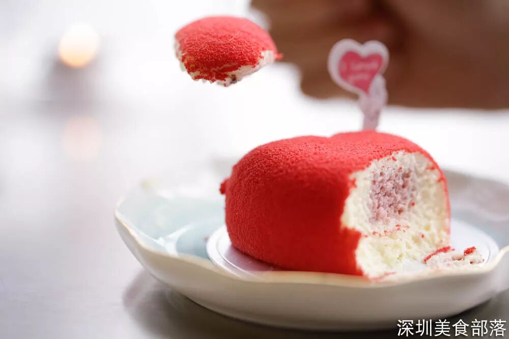 以覆盆子慕斯做夹心,表面是看起来很有质感的樱桃绒面。入口还能感觉到冰冰凉的慕斯缓缓滑入喉咙的触感。