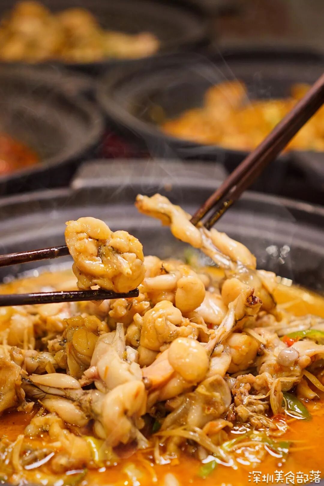 店里的蛙锅都是现点现杀,酸辣的汤汁完全浸入蛙肉,刺激酸爽,越吃越上头。