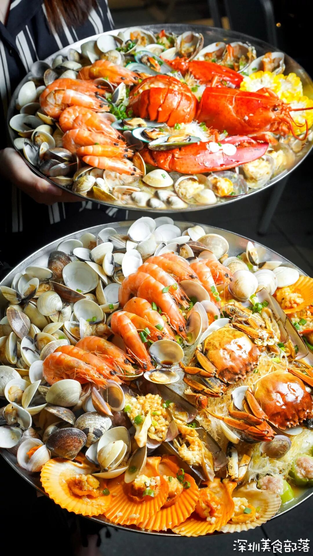 当季大闸蟹、基围虾、扇贝、小圣子,沙白、白贝、红口配上蔬菜,一个大铁盘子满到溢出!
