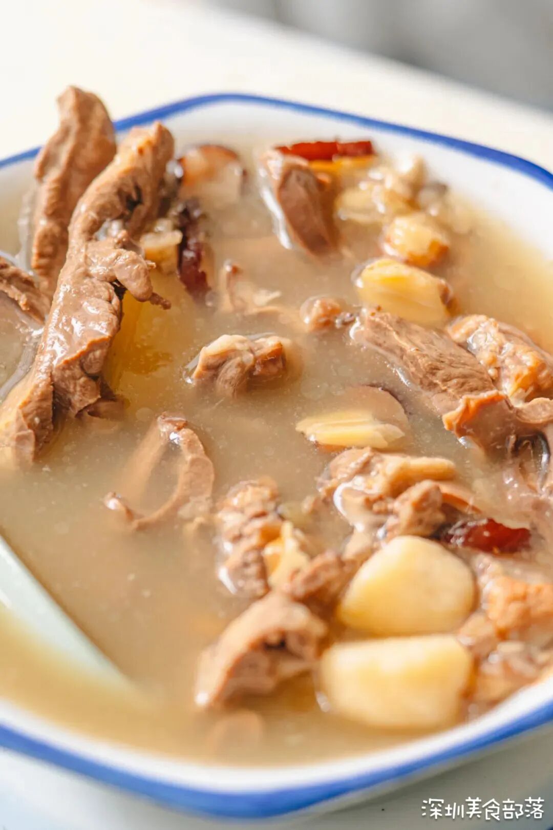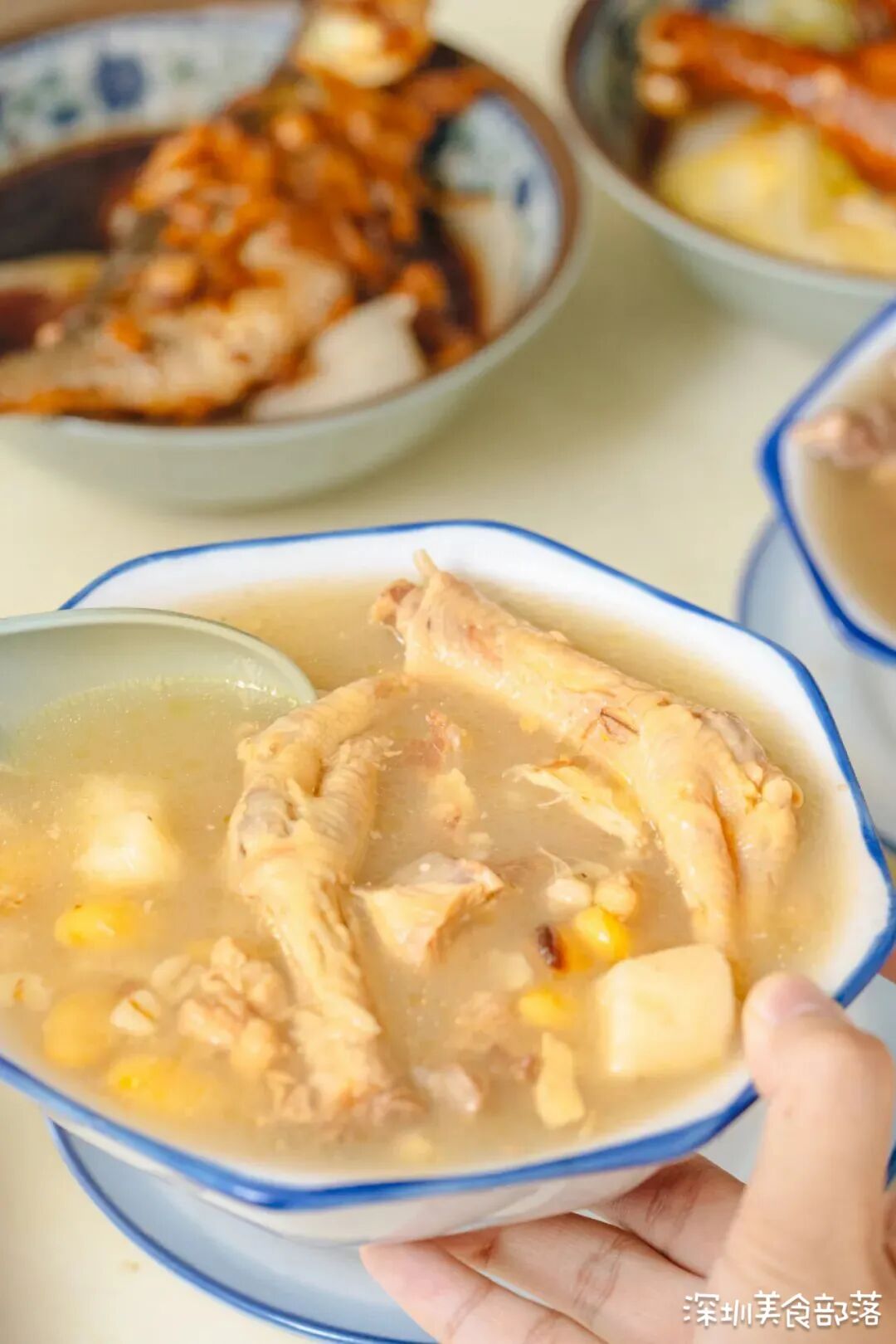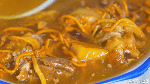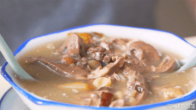 乍一看这个店铺,还会让人误会是凉茶专卖店。其实这里装的都是汤,和家里一样的同款煲,感觉妈妈都要解放双手了~店内的产品不多,都是一些家常的汤水和简餐。但胜在性价比高,点满一桌,竟然还不到一百块钱。由于是夫妻档,他们精力有限,所以就没有兼顾周末和外卖。店铺中午12点才开始营业,早上是准备食材的时间,任谁来也不开门。店铺没有菜单,作为地道的广东人,周太习惯根据时令变化来决定当天要煲的汤。只要还没掀开锅盖,你就永远不知道今天煲的是什么汤。想喝到喜欢的汤,这可是经常光顾的街坊才有的“刷脸特权”哦~像这碗干贝虫草花龙骨汤,就是熟客前一天晚上让周太做的。啧啧啧,看看这满满一碗的材料,瞬间觉得这18块钱太值了吧!我都很想问问周太,真的不怕店铺会亏本吗??记得小时候摔到手了,妈妈就会给我们煲一碗芡实扁豆薏米鸡脚汤,还美名其曰以形补形。没想到在周太的店里,这碗汤同样也是爆款。看看这用筷子轻轻就能剥离下来的鸡脚,软糯嫩滑,直接嗦肉的快乐我爱了!除了前面两款,熟客点的最多的还是这碗莲子猪心汤,但不喜欢吃动物内脏的朋友可能就会连忙摇头了。周太煲汤只会加入少许的盐调味,莲子本身会有些苦,浓浓的药材味像极了小时候妈妈要逼着我喝的那碗。莲子、猪心、芡实、山药、陈皮……瞅瞅这扎实的用料,这碗汤打包回家,怕是连我妈也要夸!每天中午12点营业的时候,周生都会把今天提供的简餐写在门口的小黑板上,卖完就会擦掉。这里的简餐也是不固定的哦,就像你回家也不知道妈妈当天做的是啥饭一样。这条乌头鱼绝对是广东人的餐桌上的熟客了,淋上咸香的豆豉酱汁,我一个人能吃一整条!这份鸡腿饭一直是附近上班族的首选,两个沉甸甸的大鸡腿下肚,感觉一天的元气又回来了!