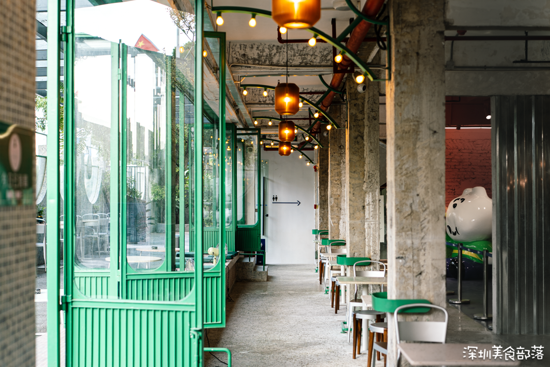 这里像浓缩版的798,是由老仓库改造的创意社区,开在蛇口码头边上,也以码头命名,一进门的牛油果绿小风扇和复古红色瓷砖太吸睛了,傍晚拍真的很像小清迈!