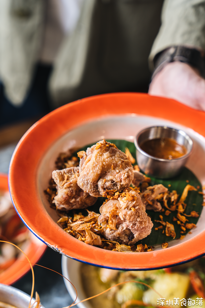泰酱是用指天椒、小米椒、黄桃等多种配料秘制而成,蘸酱后的鸡肉层次感更足,甜中带辣,酥香滑韧,简直刷新了我对炸鸡的认知。
