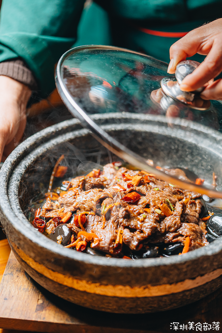 石锅做底,再用鹅卵石高温烹制,能够最大程度地保持肉的原汁原味,满满的一勺,咸中带辣,是一道下饭神器。