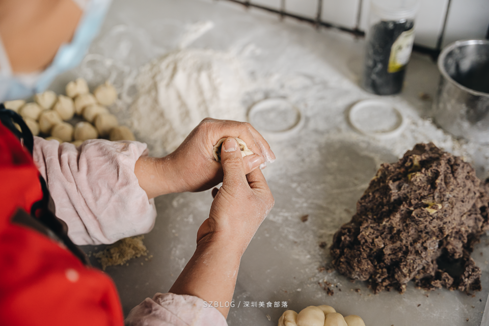 面团和馅料早上八点就要提前准备好。剩余的时间都在起酥、包陷和压饼中流逝。十几年练就的习惯,让一切动作如流水线生产般一气呵成。