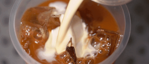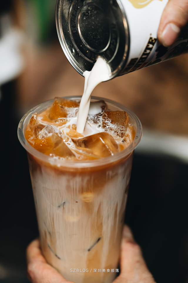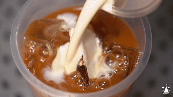 用漏网和水壶来回拉茶6次,浓厚的红茶味瞬间充斥着整个小店。冲出来以后,加入黑白淡奶冲撞出渐变层,看起来像是咖啡一样,搅匀后茶味还是很浓厚,喝起来有点微微的苦涩~