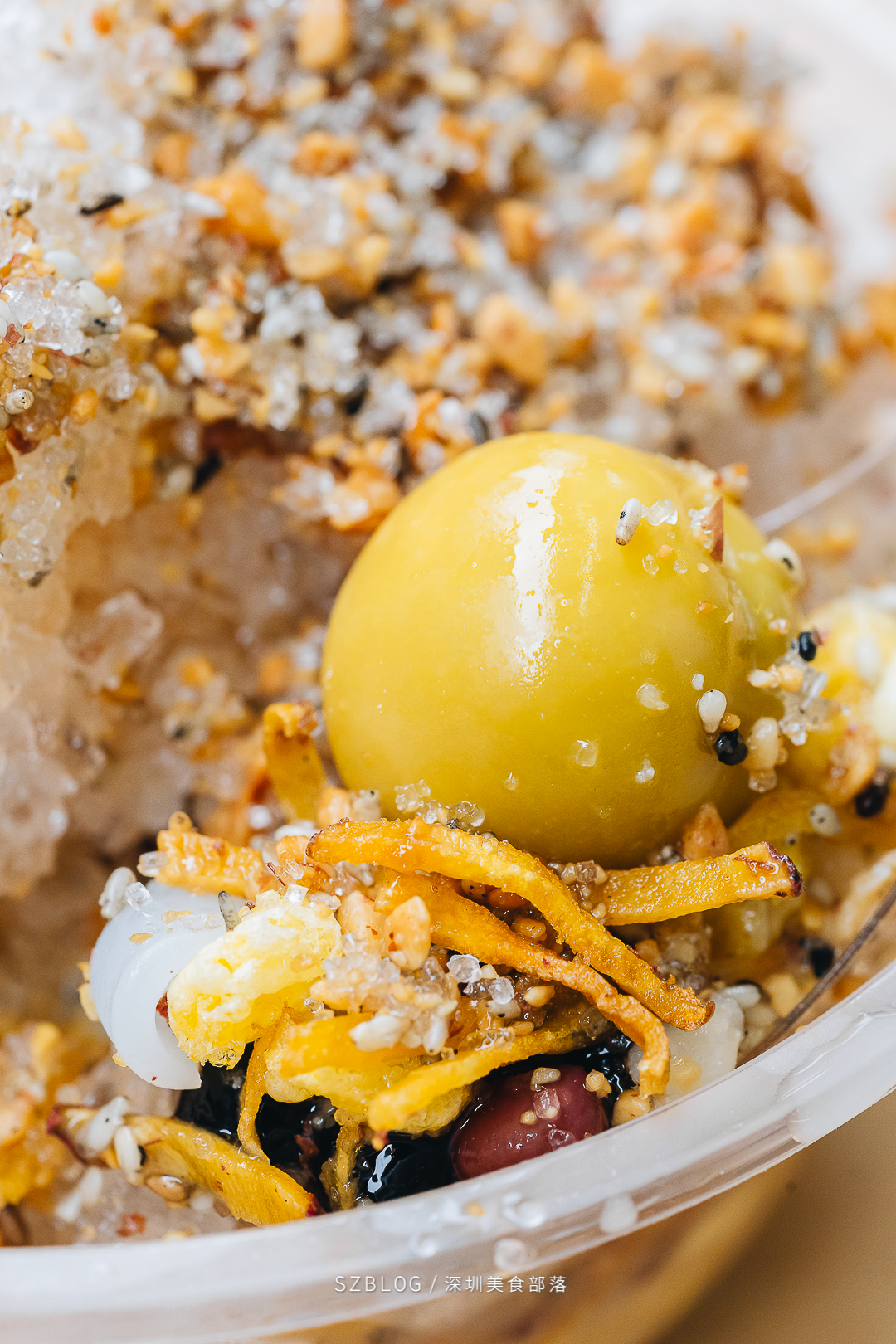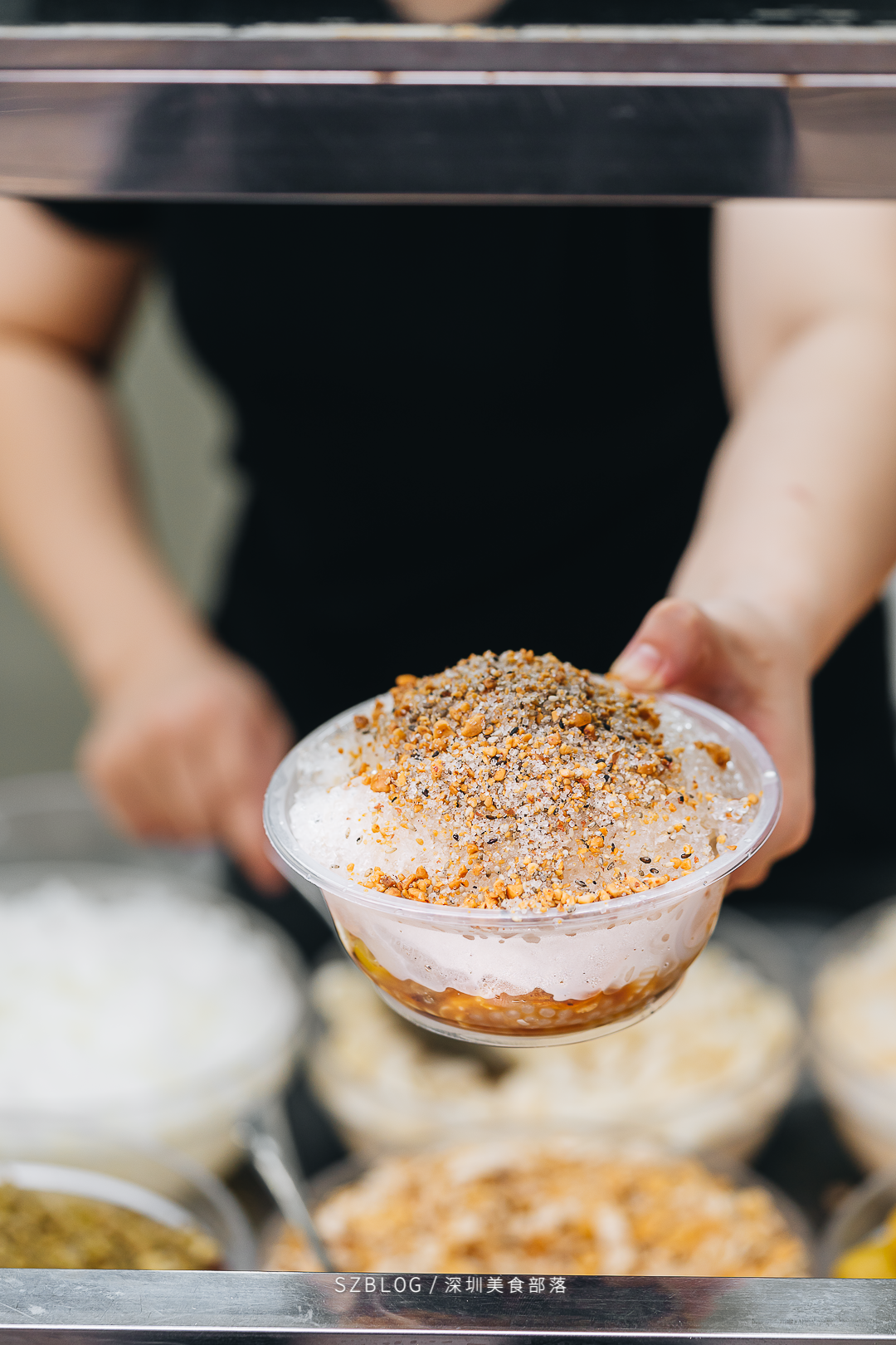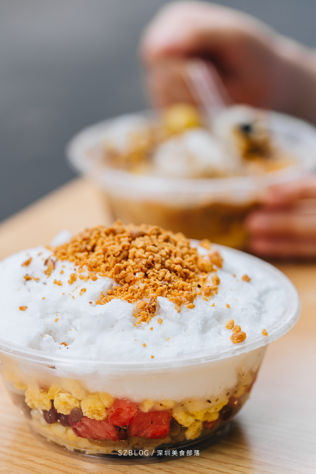 老板讲着潮汕话,热情地跟客人聊天,店里美团订单的声音一直没停过。他已经在这里4年了,从摆摊到开店靠的就是1碗刨冰,三年来都没涨过价。店里这些食材都是老板自己做的,其中通心粉、贝壳粉、地瓜丝等都是从潮汕运过来的。一碗刨冰有20多种料,也可以自己选择。当老板说加料不算钱的时候,我瞬间心动了。椰子汁头天晚上被冻成冰沙,蔡姐像个无情的刨冰机器,一勺勺地将冰刮进了碗里。唰唰唰,这幕引起打工人的强烈舒适,解压力max。从刚进门到现在,老板的手就一直都没有停过。陆陆续续收到订单,不到5分钟就做好了一份。这手速,真是不得不服啊!▧ “我们每天差不多卖500多份刨冰,天气热有时卖到1000份!”晚上9点以后,来店的客人最多。店里的5张桌子坐不下,还要在外面支几张。有时还需要排队,之前也有客人因排队人数太多,直接就走了的情况。很多人都是冲着它来店的,入口成沙,椰子味浓郁。下面堆满了各种各样的小料,上面还有一层花生碎。12元一份,拿来吧你。轻轻刮开上面的椰子冰沙,就可以看到西瓜、红豆、地瓜丝、陈皮等近20种料。拿到手里的时候,冰冰凉凉,太适合深圳30+℃的天气了。大概只有夏天,才能体会到吃冰的快乐吧。你一勺我一勺,夏日吃冰爽歪歪。与椰子冰不同,它是食用冰做成的冰沙,表面更加坚硬。顶部是红糖、炼乳和花生芝麻糖,10元1份,是碣石人传统的刨冰吃法。它需要用力猛戳拌匀才能吃,还能感受冰沙在嘴里噶蹦化开的声音。里面有汕尾人爱吃的“腌李子”和灵魂地瓜丝等近20种料,酸酸甜甜的很难拒绝啊~由椰子冰和芒果冰组合而成,底部的料跟椰子冰没有差别,顶部是奥利奥碎和花生碎。12元1份,它是店里的颜值担当,满足大家既想吃椰子冰又想吃芒果冰的欲望。![]()