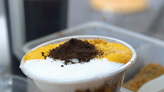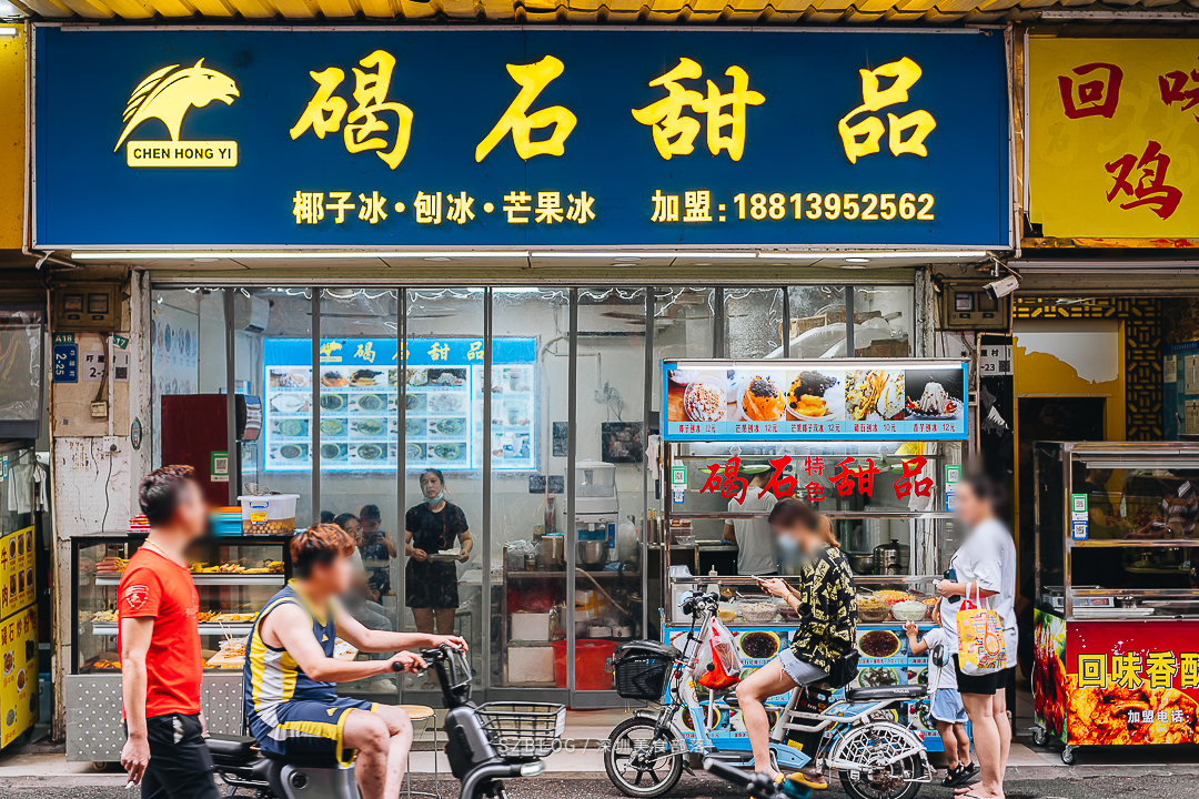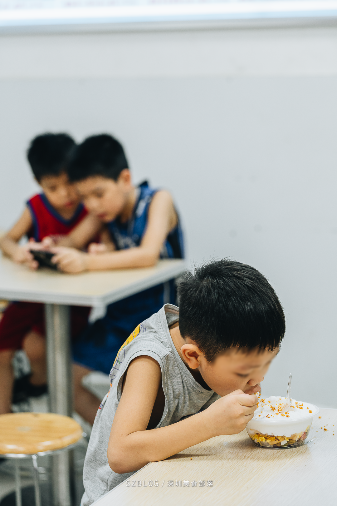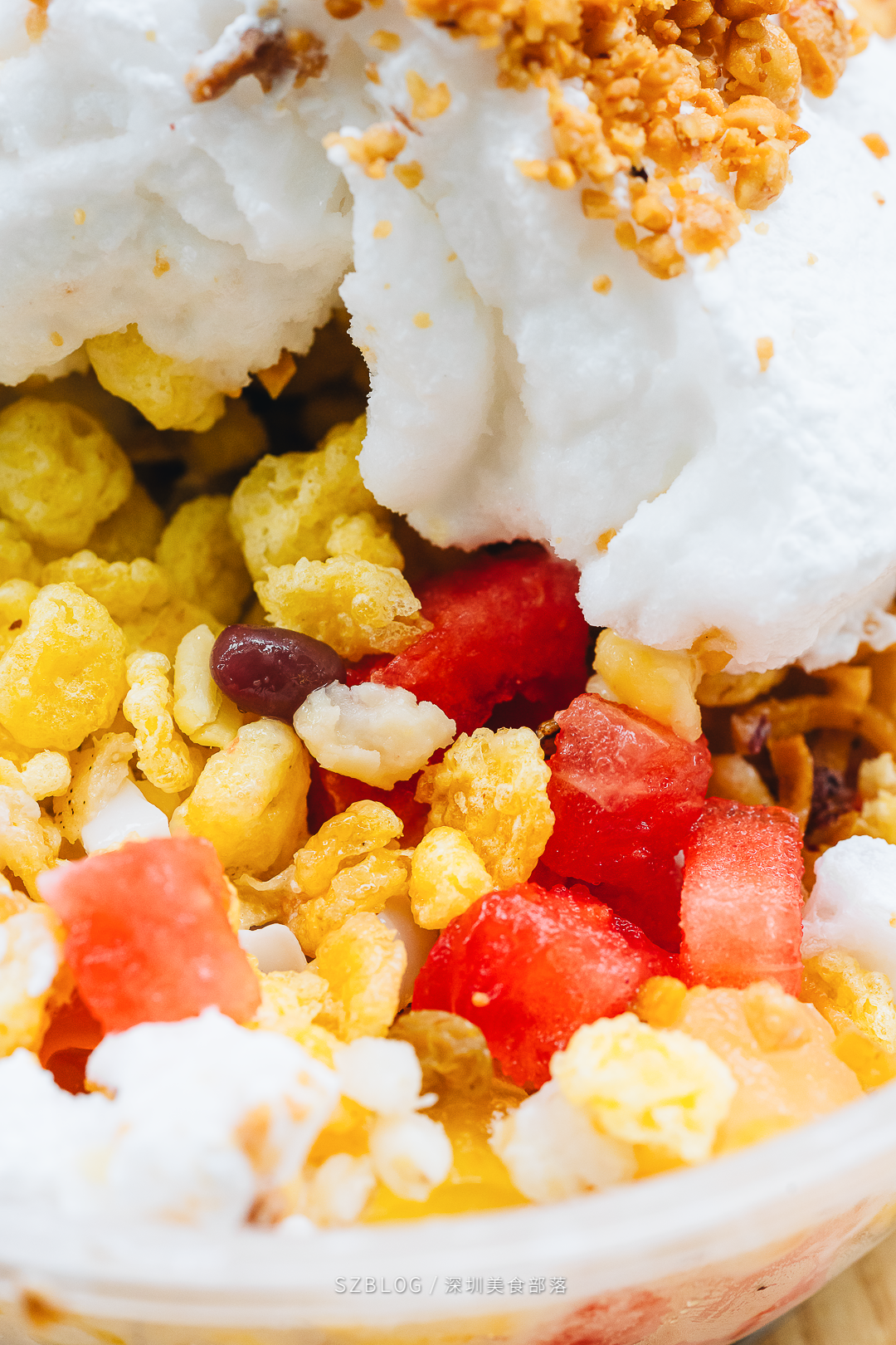 老板讲着潮汕话,热情地跟客人聊天,店里美团订单的声音一直没停过。他已经在这里4年了,从摆摊到开店靠的就是1碗刨冰,三年来都没涨过价。店里这些食材都是老板自己做的,其中通心粉、贝壳粉、地瓜丝等都是从潮汕运过来的。一碗刨冰有20多种料,也可以自己选择。当老板说加料不算钱的时候,我瞬间心动了。椰子汁头天晚上被冻成冰沙,蔡姐像个无情的刨冰机器,一勺勺地将冰刮进了碗里。唰唰唰,这幕引起打工人的强烈舒适,解压力max。从刚进门到现在,老板的手就一直都没有停过。陆陆续续收到订单,不到5分钟就做好了一份。这手速,真是不得不服啊!▧ “我们每天差不多卖500多份刨冰,天气热有时卖到1000份!”晚上9点以后,来店的客人最多。店里的5张桌子坐不下,还要在外面支几张。有时还需要排队,之前也有客人因排队人数太多,直接就走了的情况。很多人都是冲着它来店的,入口成沙,椰子味浓郁。下面堆满了各种各样的小料,上面还有一层花生碎。12元一份,拿来吧你。轻轻刮开上面的椰子冰沙,就可以看到西瓜、红豆、地瓜丝、陈皮等近20种料。拿到手里的时候,冰冰凉凉,太适合深圳30+℃的天气了。大概只有夏天,才能体会到吃冰的快乐吧。你一勺我一勺,夏日吃冰爽歪歪。与椰子冰不同,它是食用冰做成的冰沙,表面更加坚硬。顶部是红糖、炼乳和花生芝麻糖,10元1份,是碣石人传统的刨冰吃法。它需要用力猛戳拌匀才能吃,还能感受冰沙在嘴里噶蹦化开的声音。里面有汕尾人爱吃的“腌李子”和灵魂地瓜丝等近20种料,酸酸甜甜的很难拒绝啊~由椰子冰和芒果冰组合而成,底部的料跟椰子冰没有差别,顶部是奥利奥碎和花生碎。12元1份,它是店里的颜值担当,满足大家既想吃椰子冰又想吃芒果冰的欲望。![]()