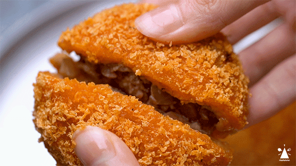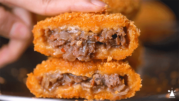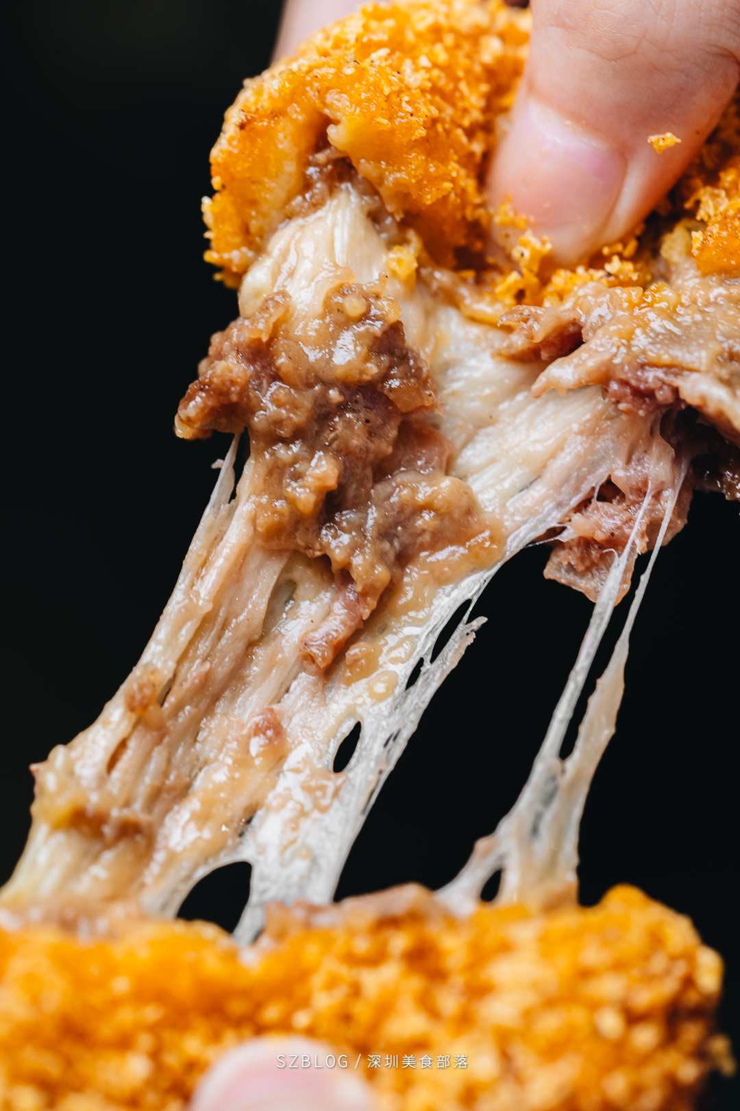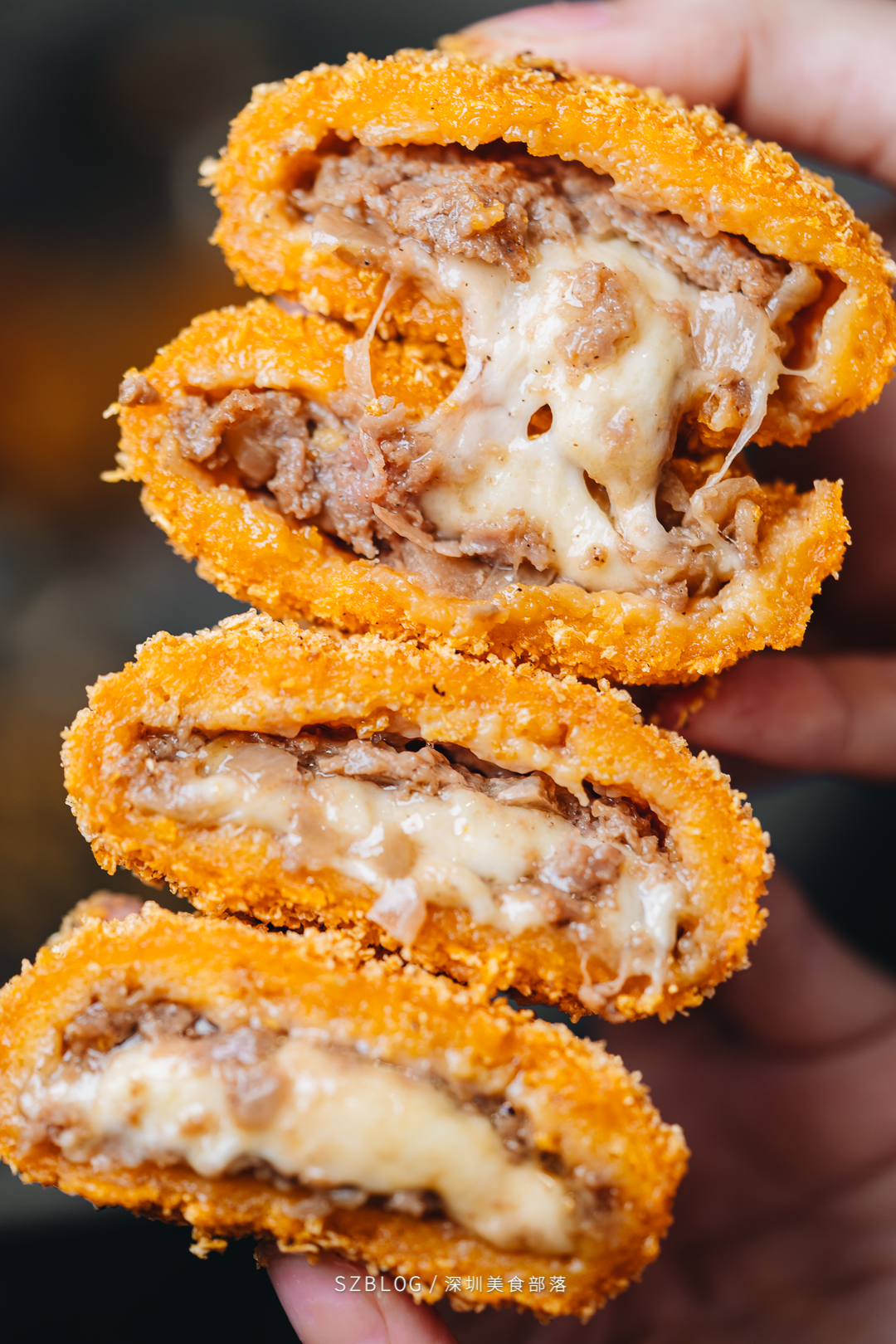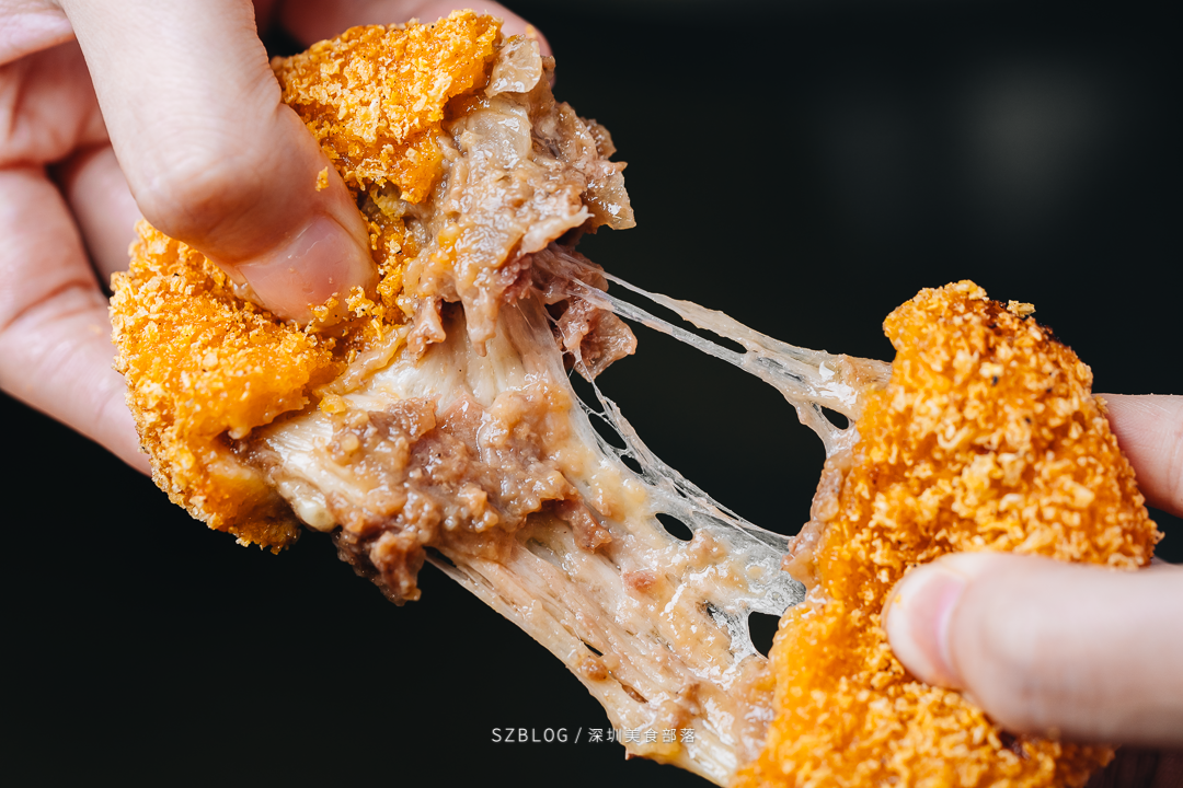 连下锅也有讲究,牛肉饼制作完后要立即下锅,复炸两次!肉汁既能锁在内层,饼也不会过于油腻!看着师傅的操作,口水都咽了N次!超离谱!只知道能拉丝,不知道它还能飙汁的我,贡献了年度最爱的一件白衣服!牛肉在高温下逼出汁水,再加上厚厚的芝士和酥脆的外皮,这谁能忍得住?!
