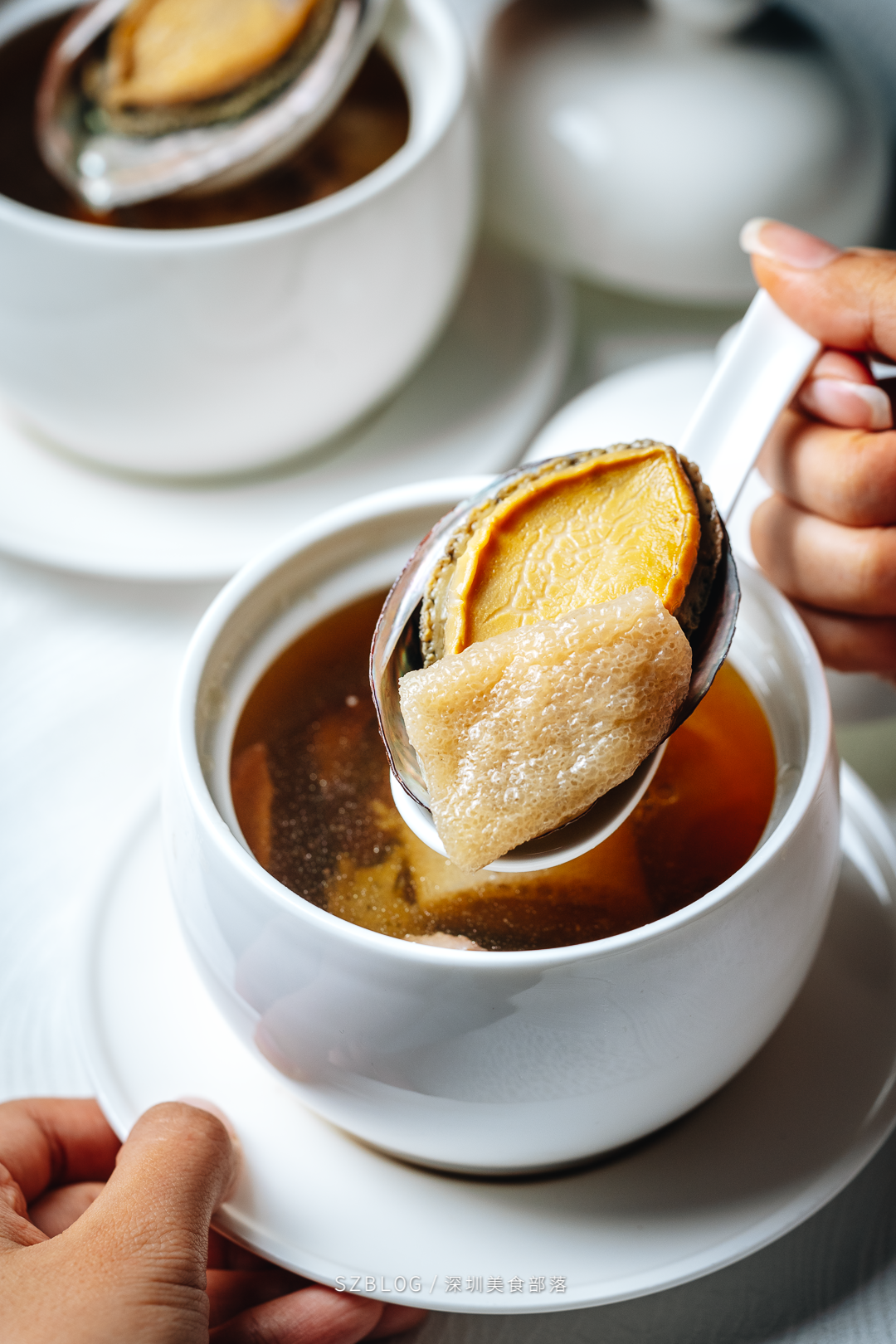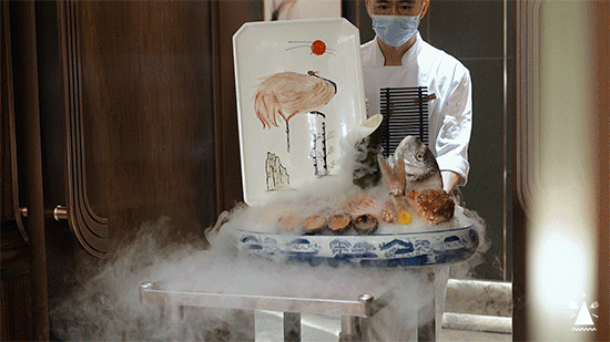 开背腌制后直接上铁板煎烤,趁热吃,酱香味十足,这一口快乐简直了!外海存养的鲍鱼,各个都是吃海藻长大。搭配贵州上等竹笙、黑土猪、老鸡、瑶柱等食材,再经过农夫山泉水慢炖3小时以上,果然整碗汤全是满满的精华。