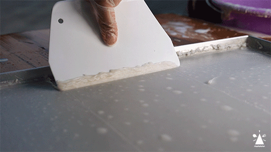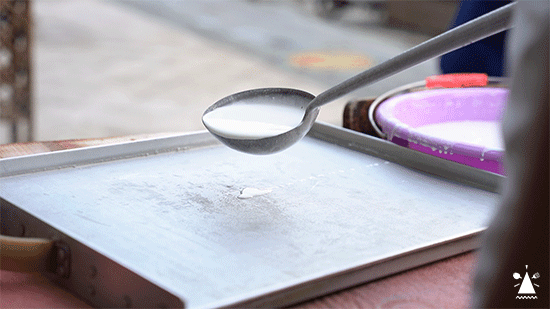 米浆都是当天现磨,卢哥说一天最少得用掉50斤米。邵哥舀起一勺粉浆倒入盘里,摇晃均匀,放入蒸柜等上2分钟,就可以出炉啦。不得不说,有点蒸肠粉那味了。