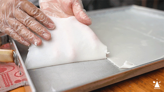 与肠粉不同的是,粿条粉皮蒸完后要静置晾凉,这样才方便撕下来。用自制的小木刀划分3份,再小心翼翼的扯下堆叠起来。要将这吹弹可破的粉皮完美的拿下,没有一定的功夫可做不来。
