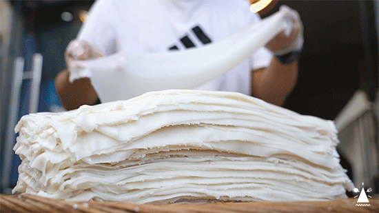 堆叠好的粉皮,要用纱布包裹起来,冷藏一晚上。卢哥说这样的粿条才不易断,口感更佳。别看邵哥做起来行云流水,端起粉皮时也得十分小心。