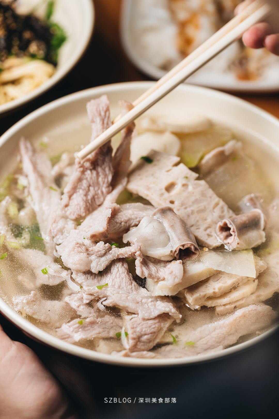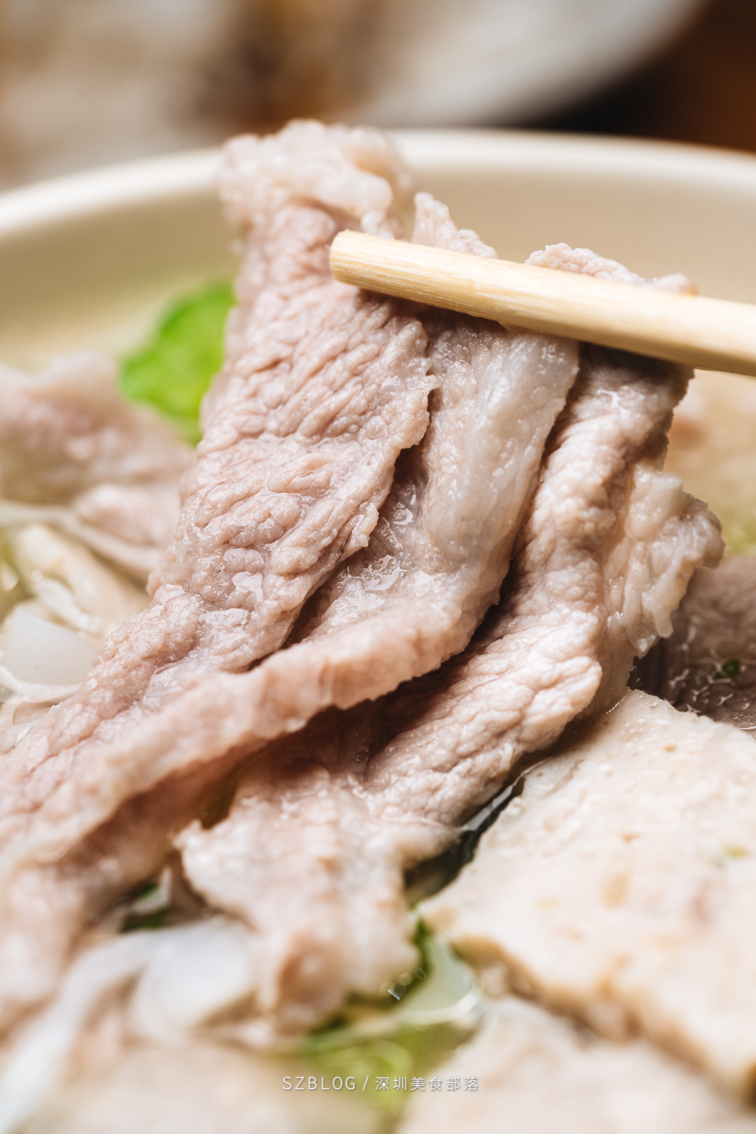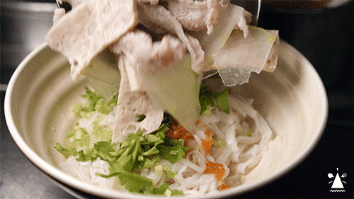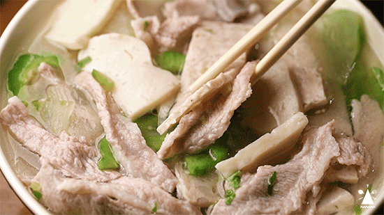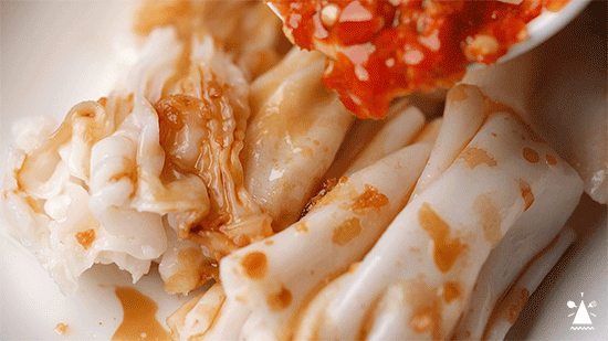 高汤洗礼过一遍的粿条,挂满了斑驳的汁水,夹起时软而不断。爽滑的口感,是嗦粉选手没有办法拒绝的程度。我最爱的吃法,就是夹起一撮粿条,放上肉,舀上汤,一口闷!