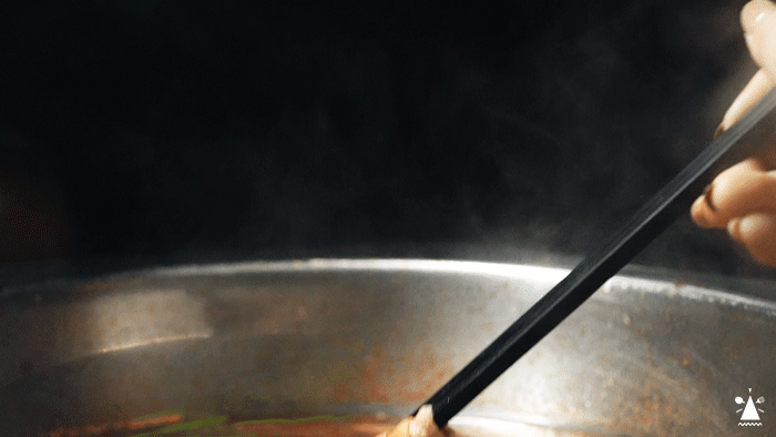 加了鸡骨、猪骨等食材慢火熬制3小时的卤水,只会用带肥肠头的整条肥肠。上桌后,是加了鹅油正在咕嘟咕嘟的卤水锅底,给肥肠们再次注入了灵魂。就算隔着一米远,都能闻到迷人的香气。