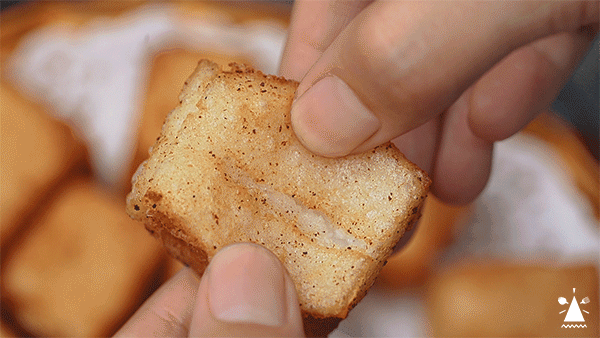 菜粿是老板托人从老家寄过来,将大米和白萝卜打成浆后,蒸制成糕,再进行油炸而成。油炸后的菜粿外酥内嫩,表皮呈金黄微焦,口感软糯甘香,让人忍不住吃下一口~