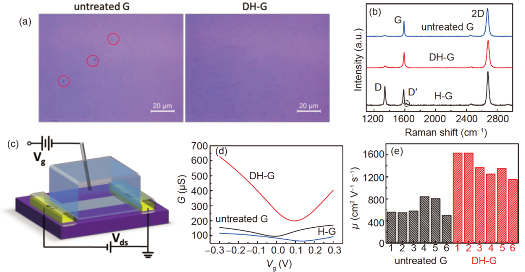 石墨烯表面经常受到碳氢化合物的污染,这会严重影响石墨烯本征的电学性质。Leiden大学 Grégory F. Schneider课题组采用一种简便的加氢-去氢策略(图1)有效地去除了表面碳氢化合物的污染,并且很好地保留了单层石墨烯优异的电子传输性质。作者利用电子显微镜可以定量地表征加氢处理后的石墨烯样品的洁净度。原位光谱显示加氢处理促进了水分子在石墨烯表面的吸附,从而形成了一个可以阻碍碳氢化合物分子沉积的保护层。此外,将加氢的石墨烯进行去氢处理可以进一步修饰表面结构,从而获得更高的载流子迁移率(图2)。图2 (a)未处理样品和去氢处理样品的光学显微图像; 未处理样品和加氢、去氢样品的Raman谱图(b)、场效应晶体管示意图(c)及其电导率与栅压的关系(d); (e) 未处理样品和去氢处理样品的载流子迁移率.这项研究提供了一种有效的CVD法制备石墨烯的后处理方案。虽然进行了化学处理,但是这种方法不仅保证了石墨烯表面的洁净度,同时还有效地保持了晶格的完整性。从而使得石墨烯具有更好的电学性能,也为其在高性能石墨烯基晶体管的应用创造了条件。