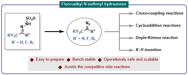 氟烷基磺酰腙作为一种多用途试剂可以用于合成多样化的含氟有机分子。虽然此类试剂早在1975年已被开发,但直到近些年才受到科学界的广泛关注。氟烷基磺酰腙是一种性质稳定且操作安全的重氮前体,不仅可作为卡宾前体参与金属卡宾转移反应,也可作为1,3-偶极子参与环加成或环化反应;能够有效替代毒性及爆炸性的氟烷基重氮化合物,有效避免了实验过程中带来的安全风险,同时也提高了官能团容忍度和底物适用范围。
