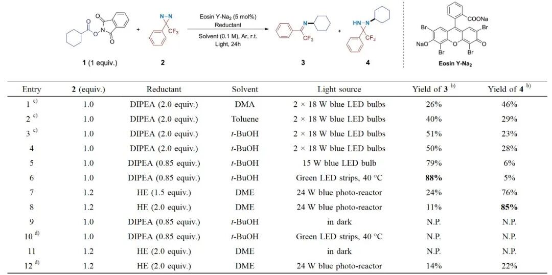 如图2所示,以叔丁醇为溶剂,DIPEA为碱,绿光灯带为光源,可以以88%的收率得到亚胺类化合物3(水解可得到烷基伯胺)。当把溶剂换为DME,以汉斯酯(HE)为氢原子供体,24W蓝光反应器为光源,则可以选择性得到双吖丙啶化合物4(烷基肼前体)。反应所使用的光催化剂均为Eosin Y的钠盐,TPD的用量分别为1和1.2当量,为一个条件温和的无需重金属参与的光催化脱羧胺化体系。