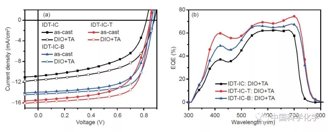 以PBDB-T为给体材料,基于IDT-IC-T和IDT-IC-B的器件的外量子效率(EQE)都高于IDT-IC(图2),最高可达到75%。基于IDT-IC-T和IDT-IC-B的器件效率分别达到了9.43%(Voc =0.86 V, Jsc = 15.91 mA cm−2, FF = 0.69)和8.72% (Voc = 0.87V, Jsc = 14.31 mA cm−2, FF = 0.70),明显高于基于IDT-IC的5.82%(Voc =0.88 V, Jsc = 11.58 mA cm−2, FF = 0.57)。这些结果表明扩大端基的共轭骨架能够简单有效地调节受体分子的聚集行为,同时增强了端基间的π–π作用,促进分子间的电荷传输,提高光伏性能。