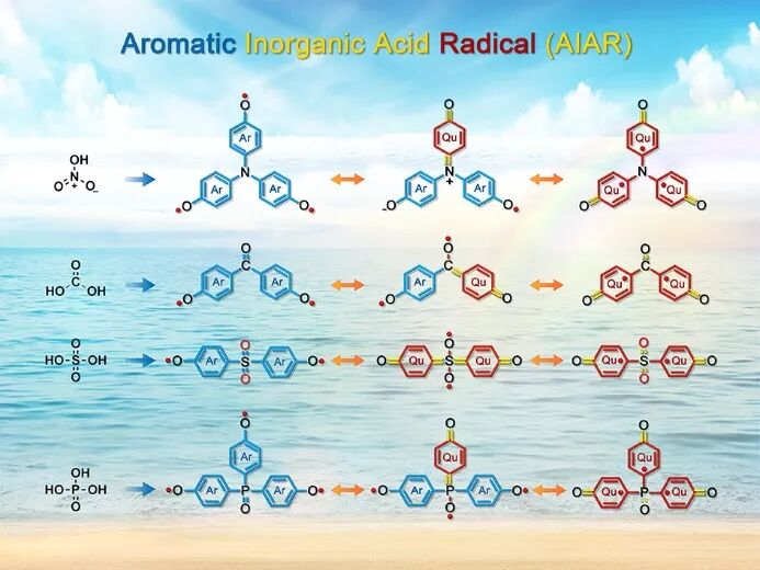 我们在前期工作的基础上(J. Mater. Chem. A, 2017, 5: 3780-3785),设计并合成了一系列无空间位阻基团保护基团的芳香化硝酸自由基(图1c-f),而且发现这类材料展现出优异的电化学稳定性和热稳定性。其稳定性来源于这类自由基丰富的共振形式,包括其类似硝基的闭壳共振结构,及其未成对电子分别位于偶数和奇数位置的单线态和三线态的开壳结构。当分子处于聚集态时,分子骨架倾向于形成更加平面的醌式结构,进而发生类硝基闭壳结构向单线态的开壳结构转变,即“聚集诱导自由基”(AIR)效应。此外,我们还发现这种芳香化的概念和方法也可应用于设计和合成其他的芳香化无机酸,诸如碳酸、硫酸和磷酸等无机酸,因此我们提出芳香化无机酸自由基(AIAR)这一新颖的中性共轭自由基的设计理念(图2)。