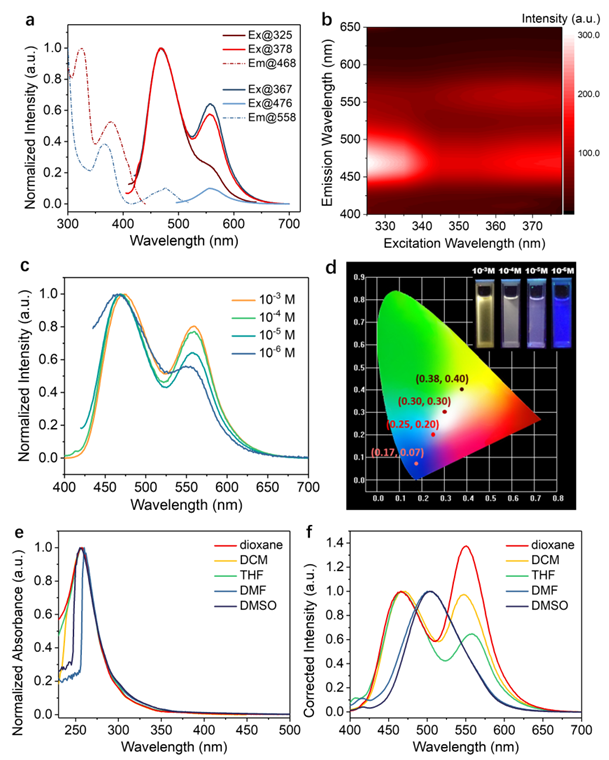 该聚合物在THF中具有高能带(468 nm)和低能带(558 nm)双发射特性。通过调节溶液的浓度(从10−3 M到10−6 M),可获得高能带和低能带的相对峰强度,从而使溶液从黄光(0.38, 0.40)经过白光(0.30, 0.30),转变成蓝光(0.17, 0.07)(图1)。另外,随着溶剂极性的增大,高能带峰逐渐红移,低能带峰位置基本保持不变,相对强度逐渐下降,且该峰在极稀溶液(10−6 M)中仍然存在。结合吸收光谱表明,高能带峰可能来自于分子内电荷转移(ICT)作用,而低能带峰由分子间和分子内两种相互作用产生。