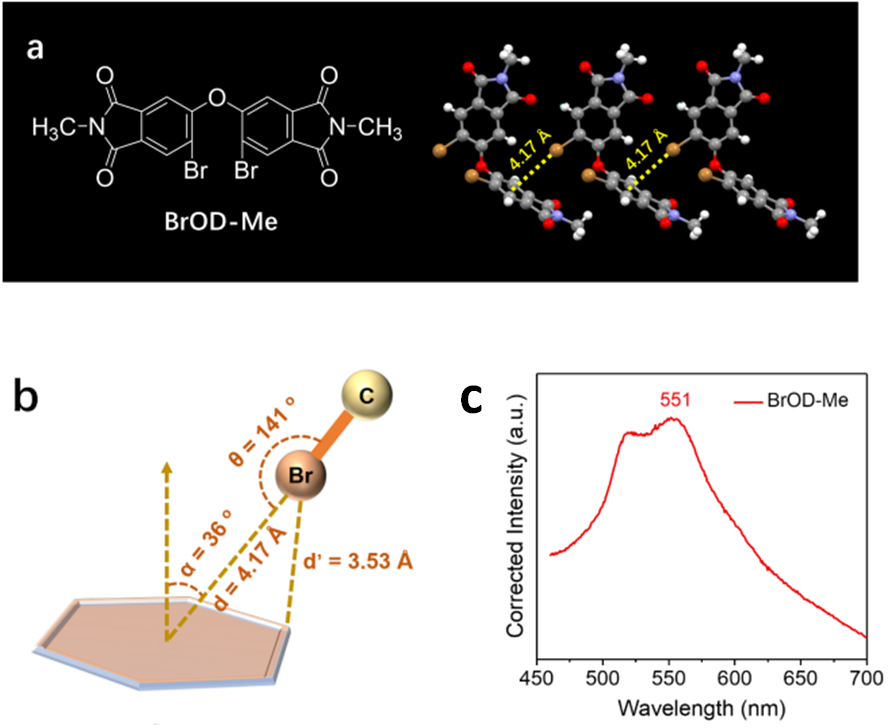 通过对模型化合物BrOD-Me的单晶结构、密度泛函理论计算和光谱行为深入分析发现,单晶的发光峰位于551 nm,与聚合物低能带峰相吻合。同时,分子中C−Br键到相邻分子间苯环中心的C−Br…π夹角为141°,Br原子与苯环上碳原子的最小距离为3.53 Å,符合C−Br…π通过“直立构型”形成相互作用的条件(图4),从而从间接证明低能带发光峰来源于聚合物分子内和分子间C−Br…π相互作用。
