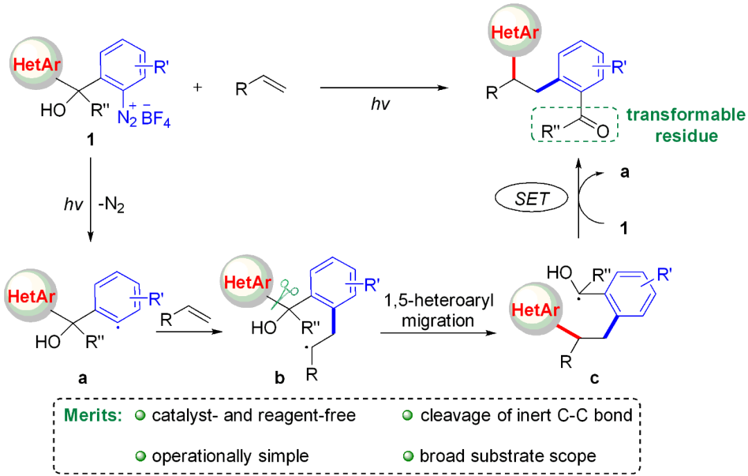 本工作中,朱晨教授课题组开发了一系列能直接被可见光激发的双芳基化试剂。将该类试剂直接与烯烃混合,在蓝光下室温搅拌就能以高收率得到各种芳基杂芳化的烷烃。反应的机理如下(图1):首先,芳基杂芳基化试剂1在蓝光激发下脱去一分子氮气,生成芳基自由基中间体a,a对烯烃进行自由基加成,从而形成中间体b,b经历六元环过渡态后断裂惰性碳碳键,发生分子内1,5-杂芳基迁移,从而得到中间体c,c在持续光照条件下直接被另一分子1单电子氧化为碳正离子,随后脱去氢质子得到最终产物,与此同时,1被单电子还原为a而使反应得到循环。