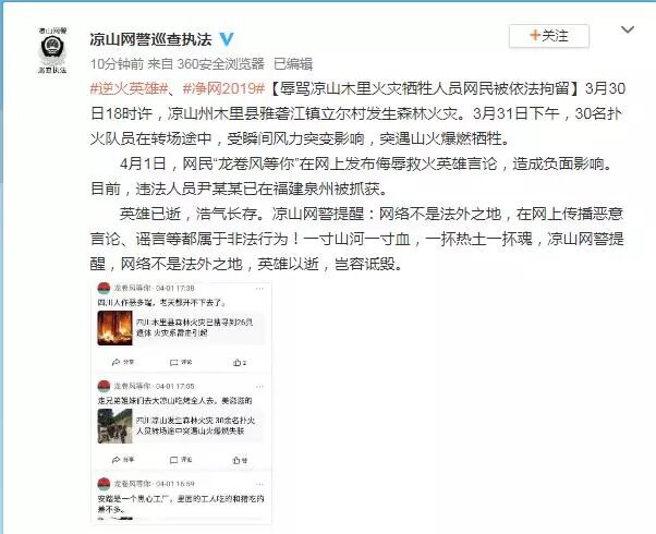 四川凉山州30名扑火队员不幸殉职的消息让人心痛不已,无数人含泪送别。然而今天有网友发现,竟然有人敢公然诋毁救火英雄……
