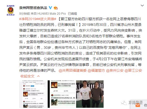 @泉州网警巡查执法:有网民尹某云(男,30岁,贵州毕节市人)以自己的百度账号“龙卷风等你”,在网上发布多条侮辱四川因公牺牲消防员的言论,造成了极其恶劣的社会影响,引发网民的强烈愤慨。公安机关发现后迅速展开侦查,于4月2日下午在晋江市安海镇将尹某云抓获。尹某云的行为已涉嫌寻衅滋事罪,目前已被公安机关刑事拘留,等待他的将是法律的严惩。