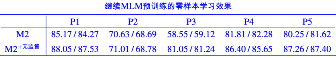刚才我们讨论了无标签数据继续预训练 MLM 的提升,如果回到 PET 的目标场景,直接用小量的标签数据配合特定的 Pattern 训练 MLM 又如何呢?