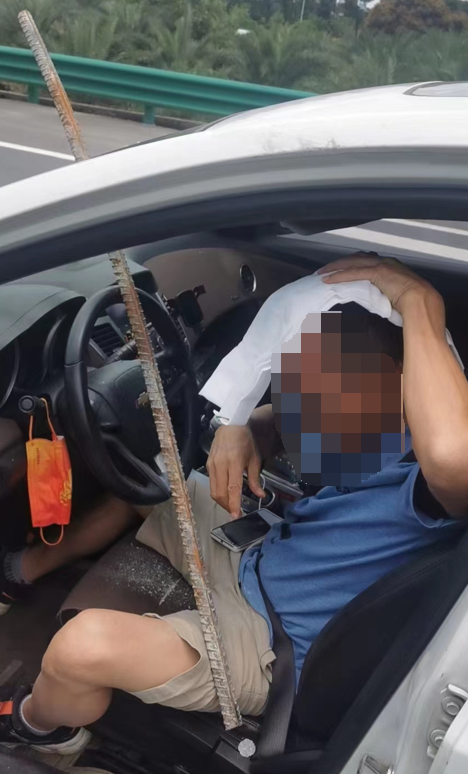只见一条长钢筋直插入驾驶座