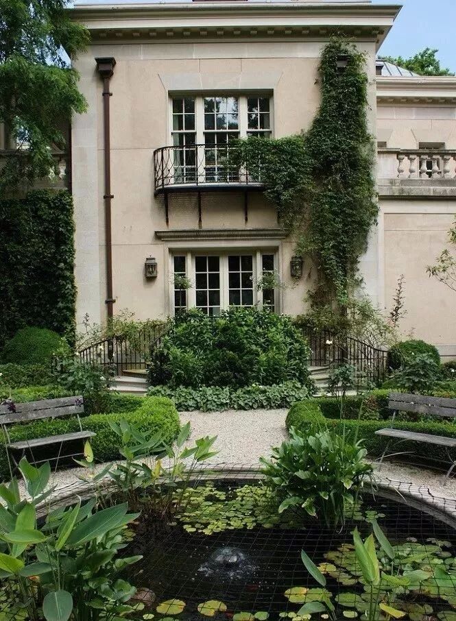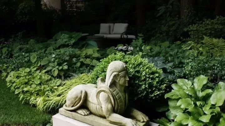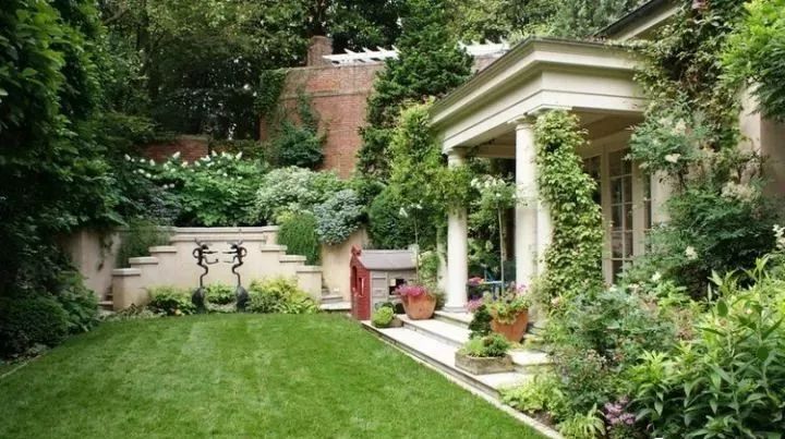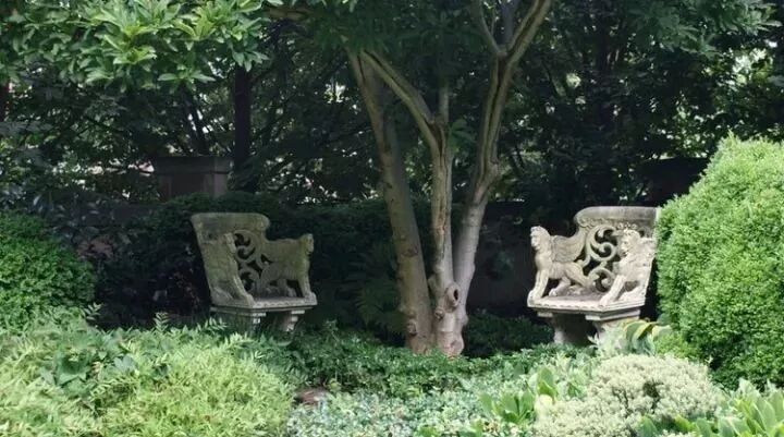 雕塑喷泉,罗马柱是这类庭院的主要元素。