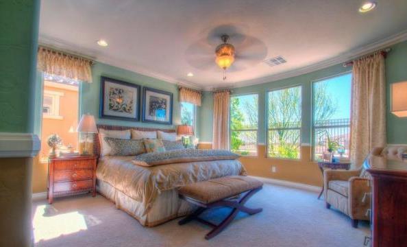 在装饰上美式田园风格十分讲究,比如喜好卧室,一般的不设顶灯,多用温馨柔软的成套布艺来装点。