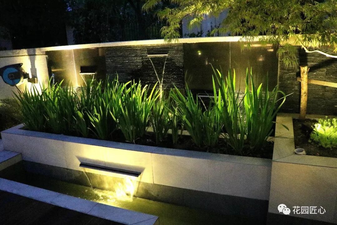 地板引导光源,墙面花坛的环境光源,给人以温馨浪漫的氛围。盆景和景墙地强调光源,给了花园令人振奋的效果。
