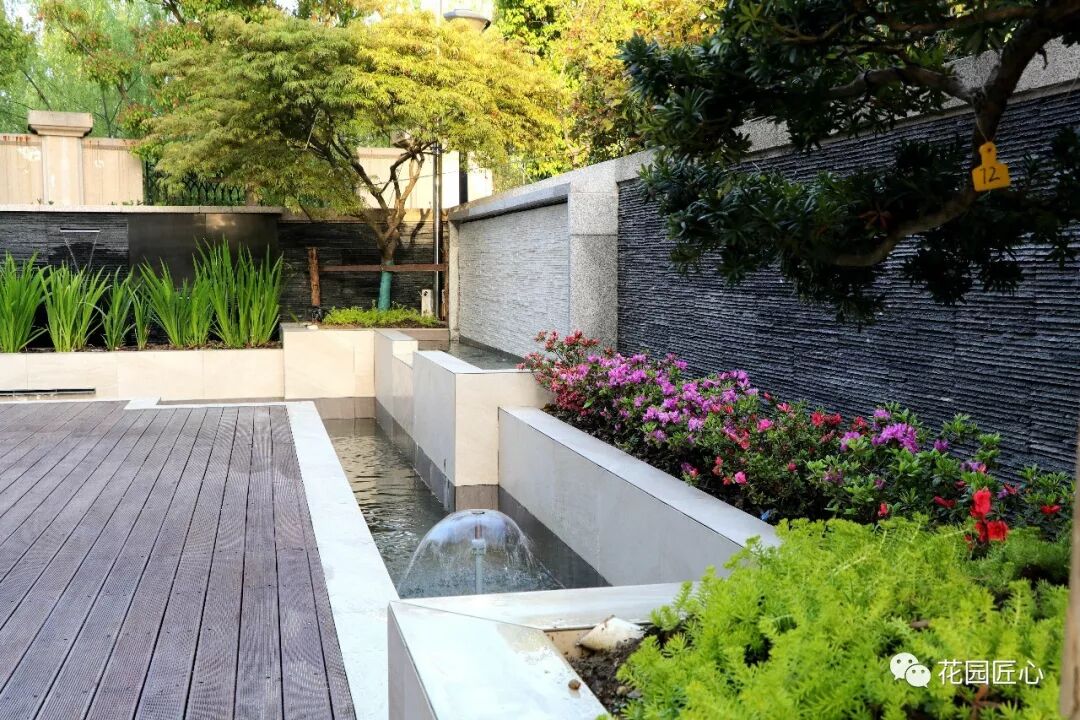 3、花园面积不大,主要的视觉所及景观部分,以立面为主,流水墙以及造型松树、羽毛枫等。