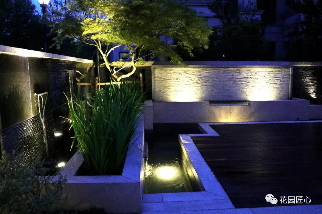 这座花园的造型象一个9字。东面是一条窄窄的通道。南面豁然开朗。在东面我们在铺装上做了横条纹的简单嵌色铺装,增加道路的延伸感,淡化通道的狭窄。在每个通道的拐角,通过美丽的灌木丛配合射灯,将原有的“死角”转化为路边一个个亮点的风景。通道变得愉快而静谧。南面的木地板区,水流环绕,墙面潺潺流水,水池涌泉,花坛里安静地扇面流水,三种流水方式,使原本平淡地空间立即变得有生趣和层次丰富。