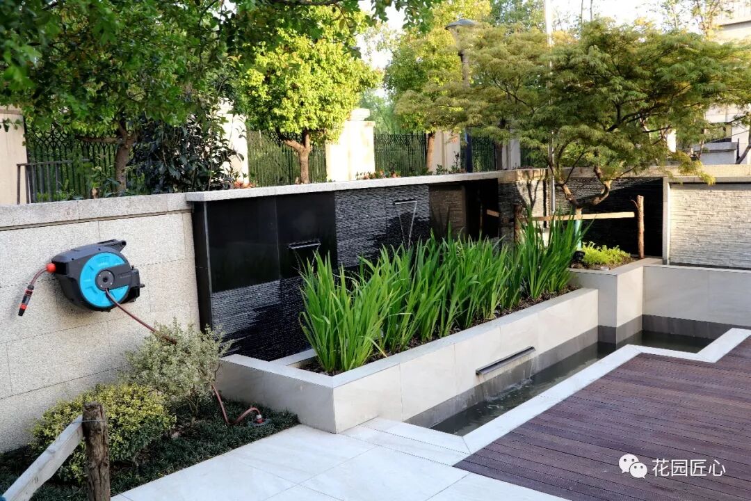 4、流水墙的形式应该有两种以上的变化,并配合鸢尾等水生植物,营造水流环抱的活泼气氛。