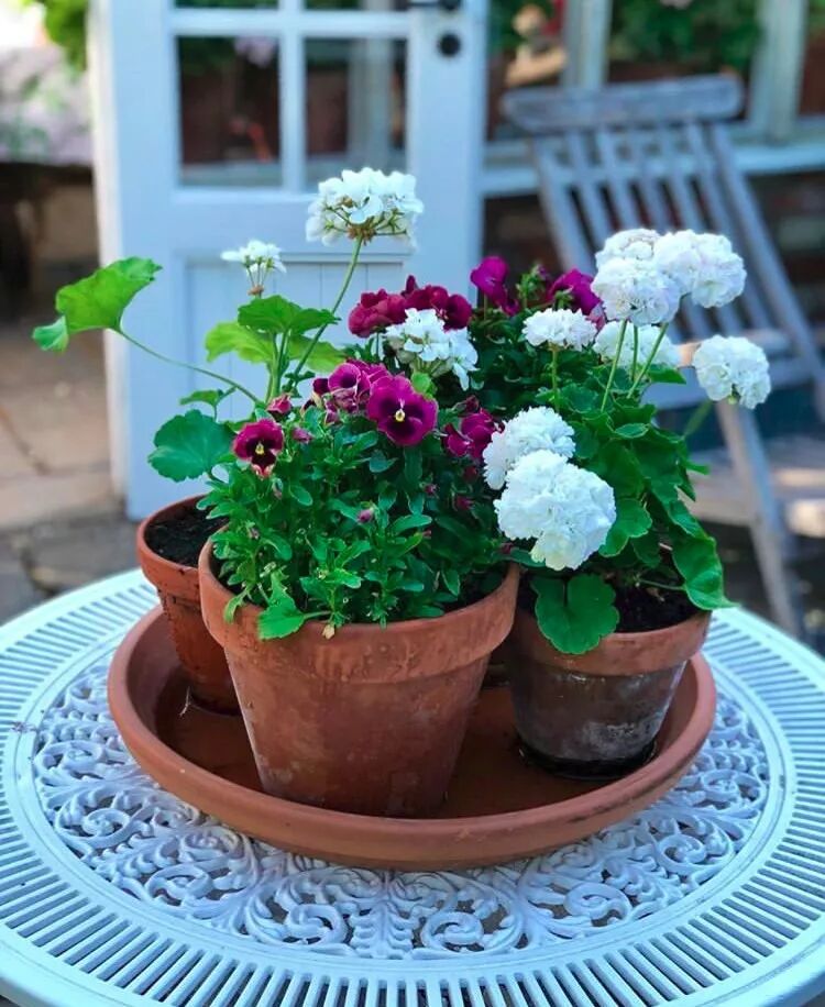 天竺葵还可以进行组盆种植,香雪球、矮牵牛、三色堇、紫罗兰等植物是天竺葵组盆的最佳选择。组盆植物要选择花期接近、开花量多的植物,才能有一个好的组盆效果。