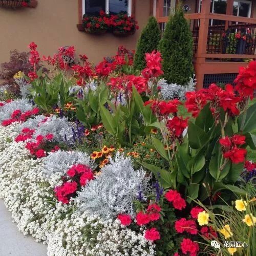 可以将株高接近的观花观叶植物种植在一起,例如香雪球、三色堇、花叶络石、羽衣甘蓝、金鱼草、欧报春、紫罗兰等。